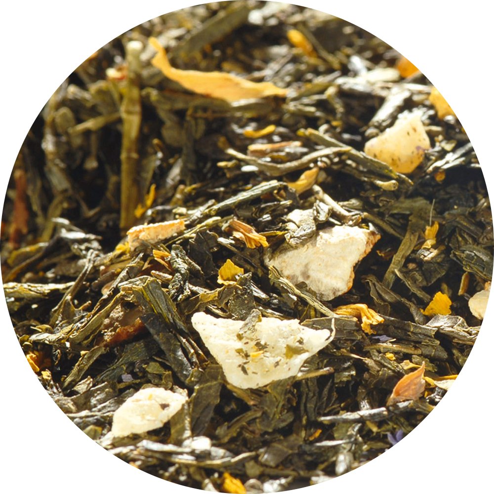 Grüner Tee (79%), Ananasstücke (Ananas, Zucker, Säuerungsmittel: Zitronensäure), Aroma, Orangenschalen, Papayastücke (Papaya, Zucker), Mangostücke (Mango, Zucker, Säuerungsmittel: Zitronensäure), Sonnenblumenblüten, Malvenblüten.