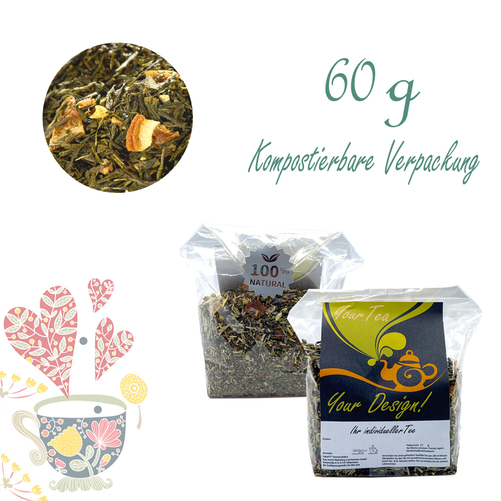 Grüner Tee (84%), Orangenecken (8%), natürliches Orangen-Aroma, Orangenschalen (2%), Orangengranulat (2%) (Orangensaftkonzentrat, Orangenzellen).