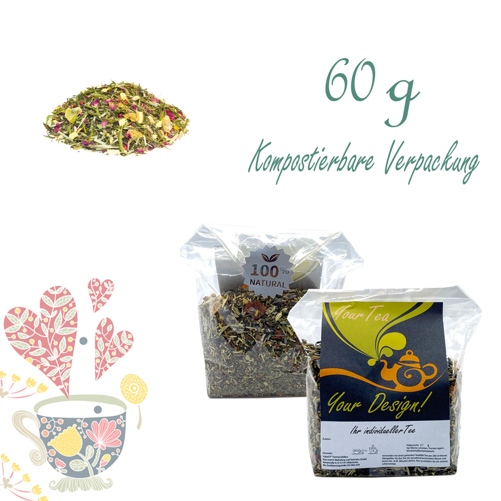 Grüner Tee (56%), Weißer Tee (9%), Orangenecken, Zitronengras, Rosa Pfeffer, Ingwer, Moringablätter, Rosenblütenblätter, Aroma, Jasminblüten, Kiwistücke, Physalisscheiben.