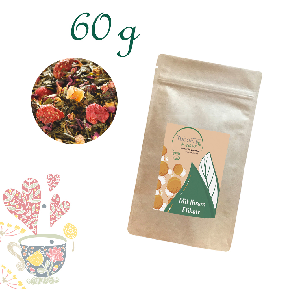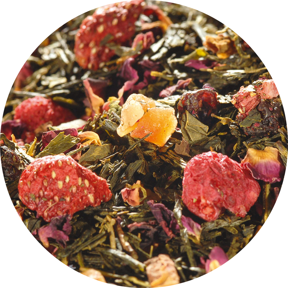 Grüner Tee (72%), Korinthen, Aroma, Rosenblütenblätter, Ananasstücke (Ananas, Zucker, Säuerungsmittel: Zitronensäure), Papayastücke (Papaya, Zucker), Erdbeerstücke, Himbeeren (2%), natürliches Aroma.