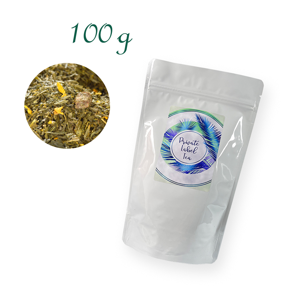 Grüner Tee, Aroma, Pfirsichstücke (2%), Sonnenblumenblüten.