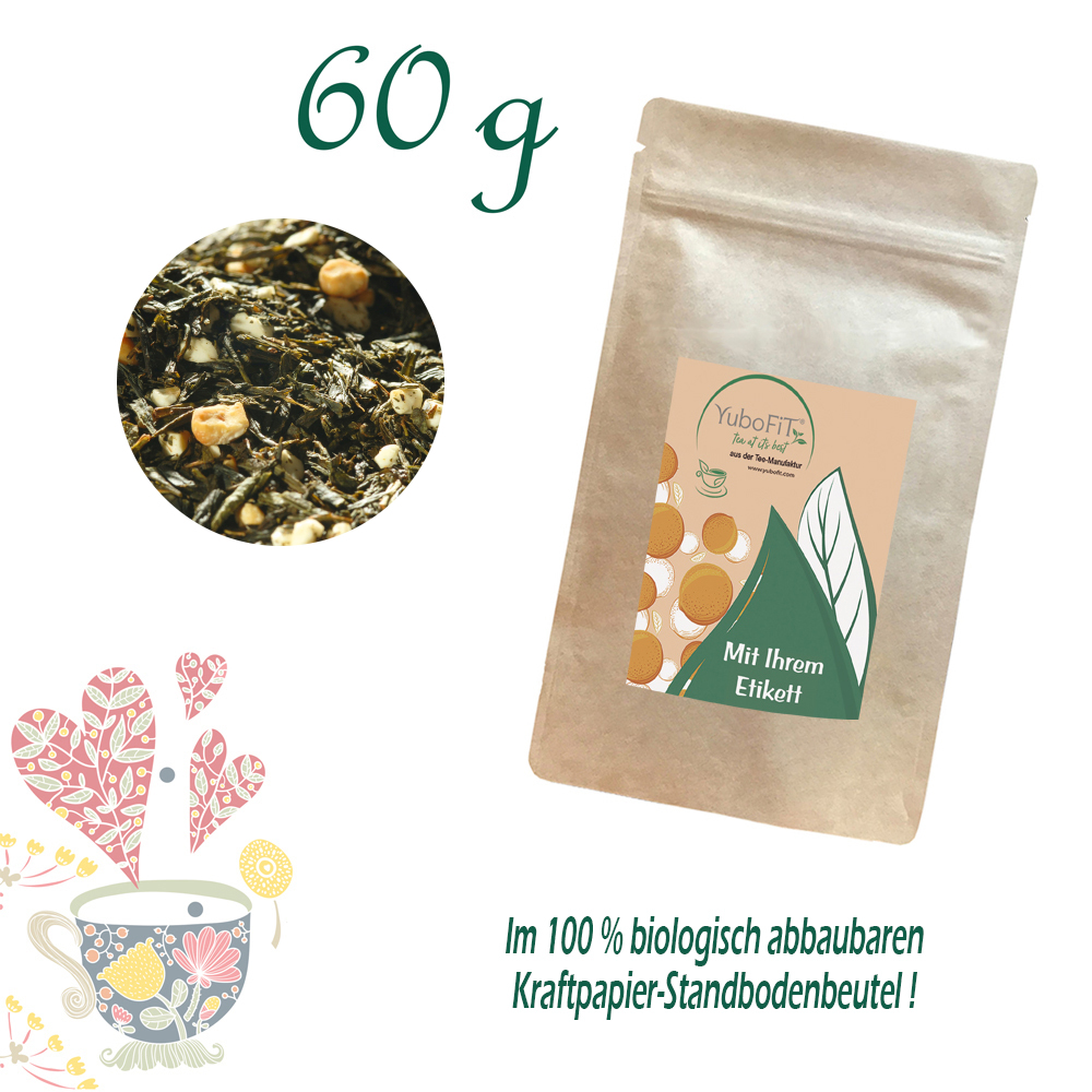 Grüner Tee (64%), Nougatstücke (30%) (Zucker, Glukosesirup, MANDELN, Kartoffelstärke, Honig, Kakaobutter, HÜHNEREIWEISS, natürliches Vanille-Aroma), Aroma.