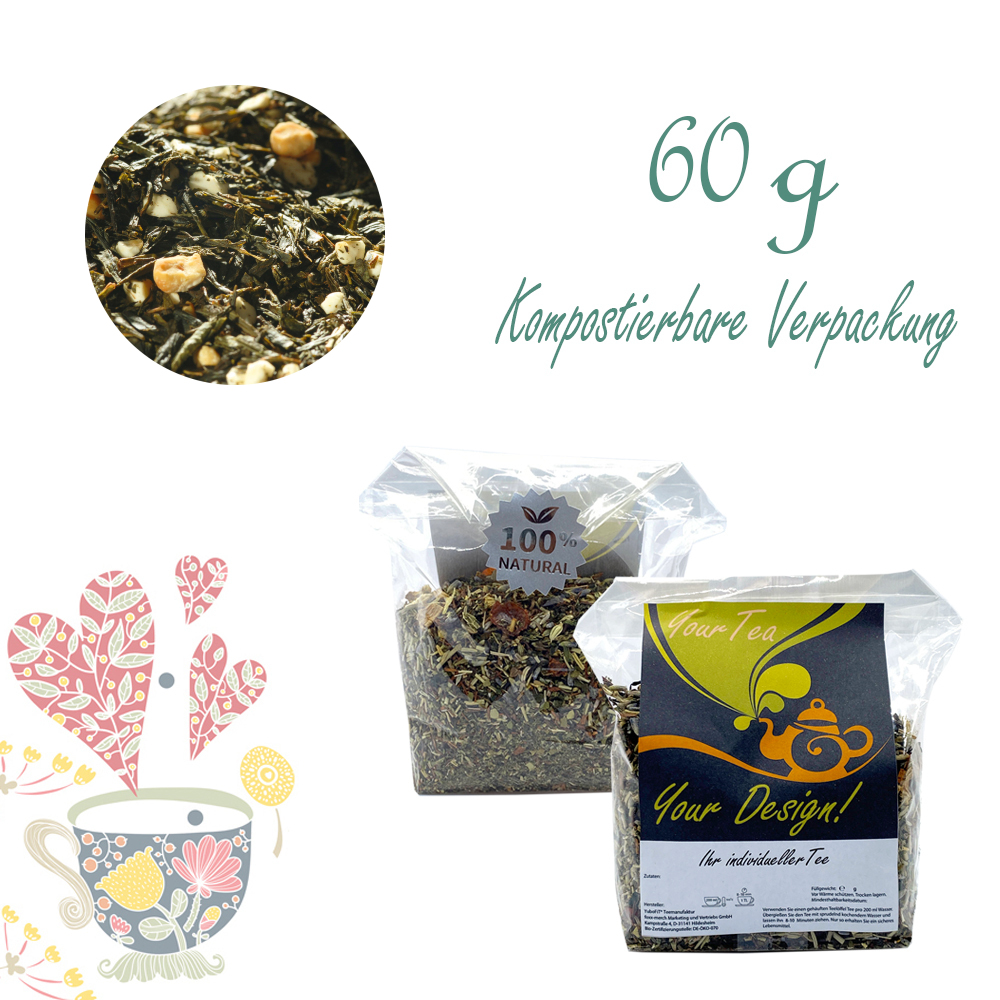Grüner Tee (64%), Nougatstücke (30%) (Zucker, Glukosesirup, MANDELN, Kartoffelstärke, Honig, Kakaobutter, HÜHNEREIWEISS, natürliches Vanille-Aroma), Aroma.