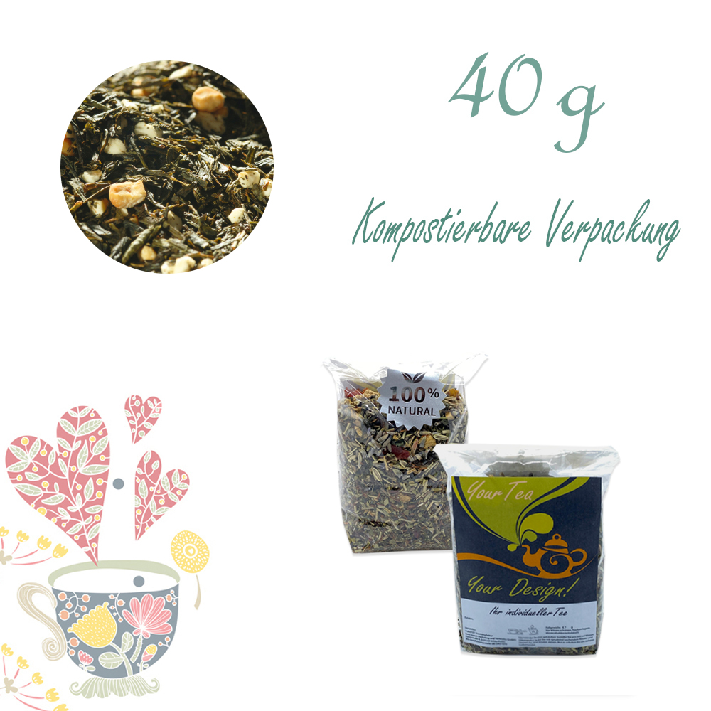 Grüner Tee (64%), Nougatstücke (30%) (Zucker, Glukosesirup, MANDELN, Kartoffelstärke, Honig, Kakaobutter, HÜHNEREIWEISS, natürliches Vanille-Aroma), Aroma.