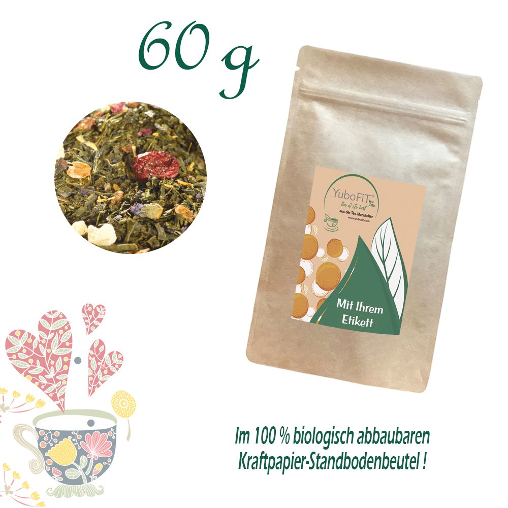 Grüner Tee (66%), Ananasstücke (Ananas, Zucker, Säuerungsmittel: Zitronensäure), Mangostücke (Mango, Zucker, Säuerungsmittel: Zitronensäure), Apfelstücke, Haselnussblätter, Sauerkirschen, natürliches Aroma, Sonnenblumenblüten, Hagebuttenschalen, Rosenblütenblätter, Malvenblüten, Ringelblumenblüten, Pfefferminze.
