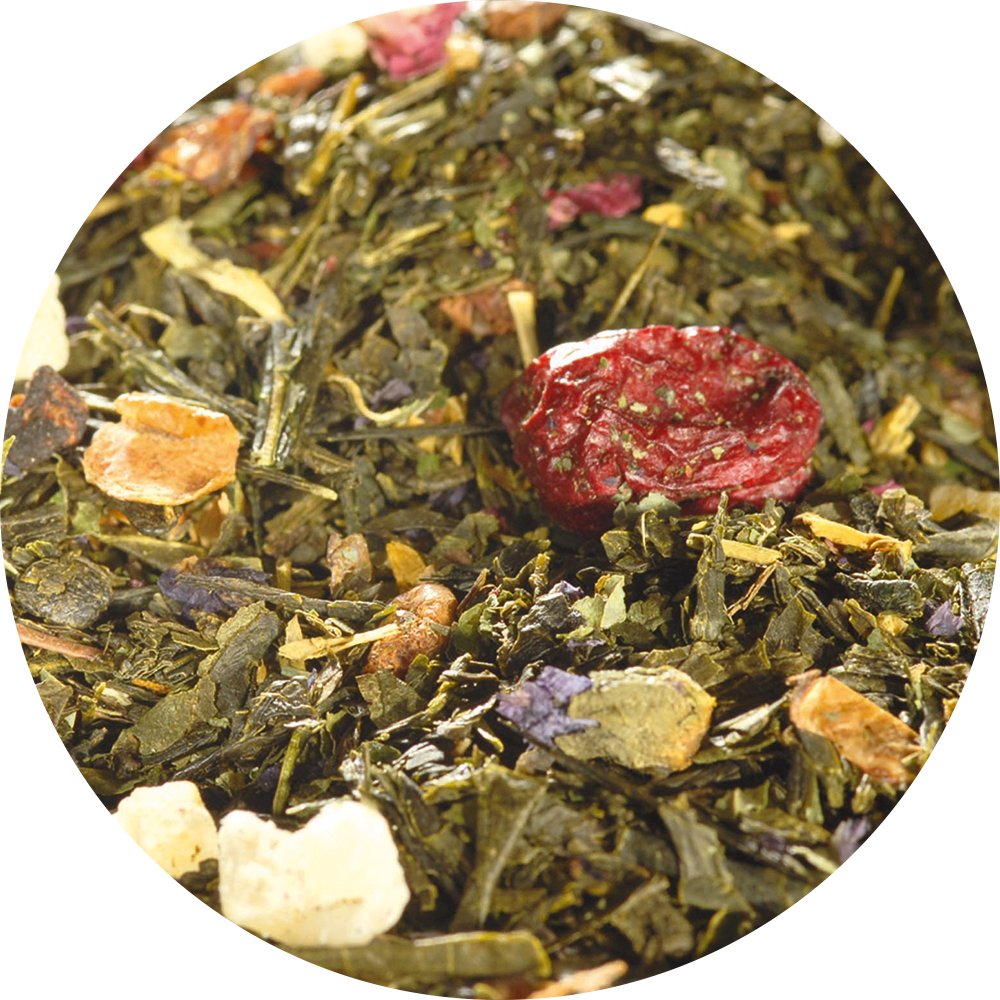 Grüner Tee (66%), Ananasstücke (Ananas, Zucker, Säuerungsmittel: Zitronensäure), Mangostücke (Mango, Zucker, Säuerungsmittel: Zitronensäure), Apfelstücke, Haselnussblätter, Sauerkirschen, natürliches Aroma, Sonnenblumenblüten, Hagebuttenschalen, Rosenblütenblätter, Malvenblüten, Ringelblumenblüten, Pfefferminze.