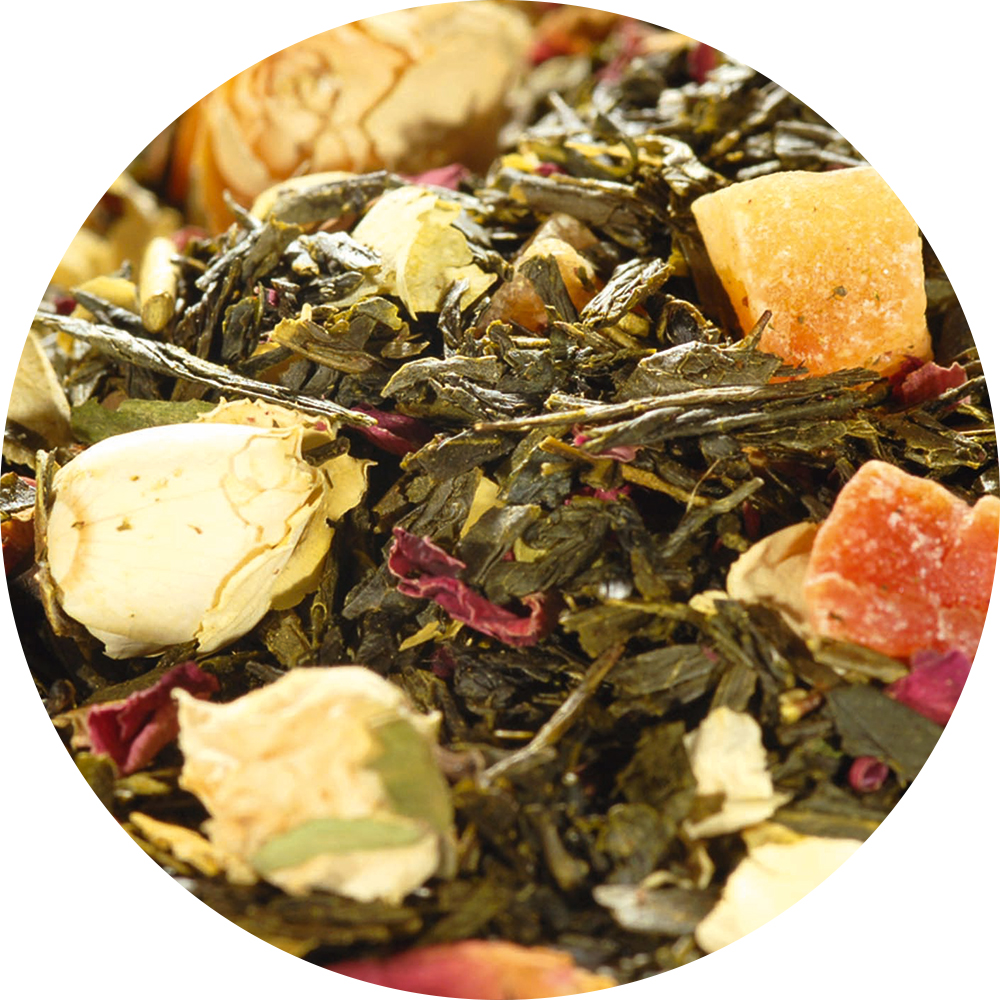Grüner Tee (65%), Papayastücke (Papaya, Zucker), Mangostücke (10%) (Mango, Zucker, Säuerungsmittel: Zitronensäure), Rosenknospen, Aroma, Rosenblütenblätter.