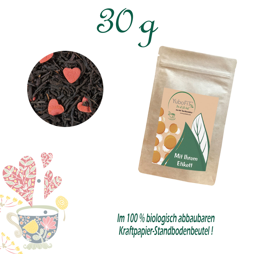Zutaten: Schwarzer Tee (83 %), Zuckerherzenstreudekor (Zucker, Reismehl, pflanzliches Öl (Rapsöl, ganz gehärtetes Rapsöl), Verdickungsmittel: Traganth, Farbstoffe: E120, E160a, Aroma) (15 %), Aroma