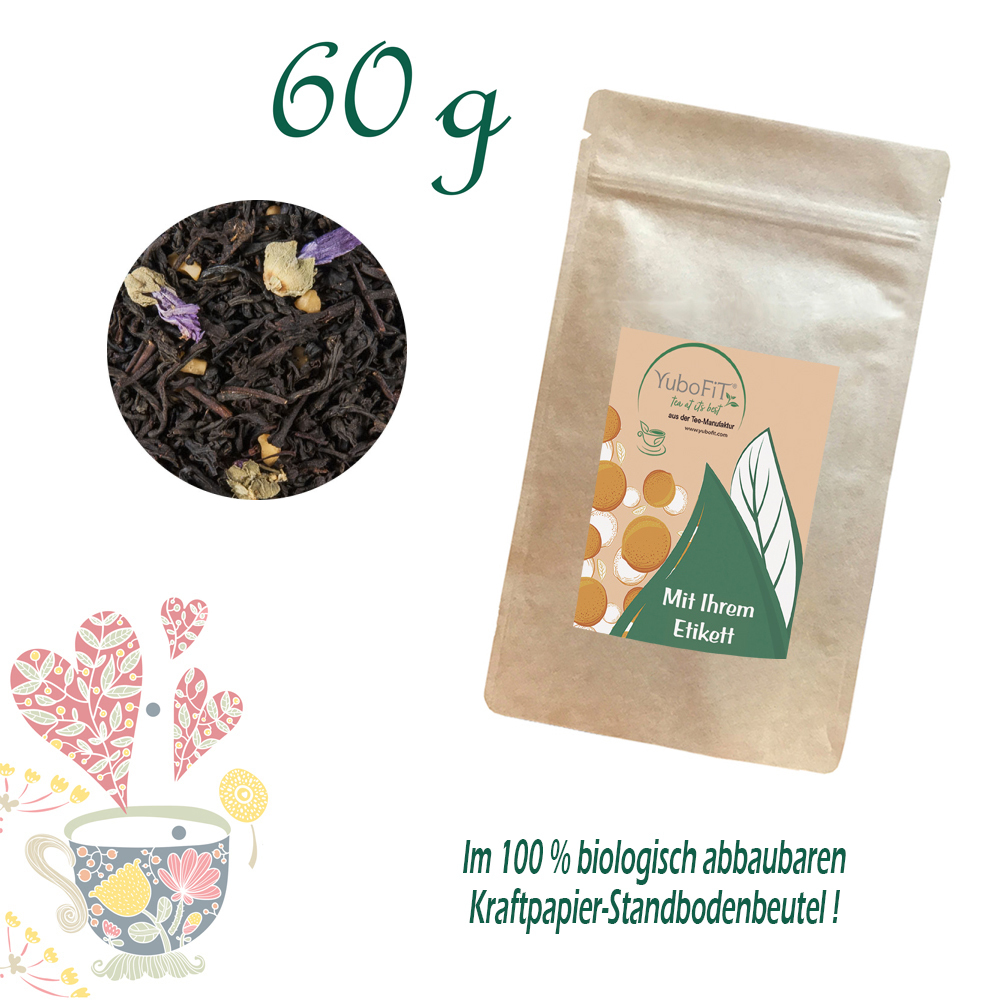 Schwarzer Tee (87 %), Mandelstücke, Aromen, Vanillestücke, Malvenblüten