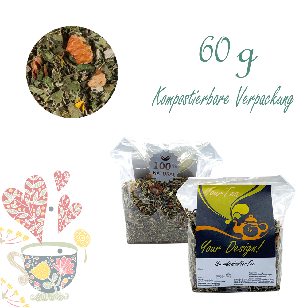 Brombeerblätter, Anis, Fenchel, Apfelstücke, Holunderbeeren, Hagebuttenschalen, Hibiskusblüten, Sonnenblumenblüten, Ringelblumenblüten, Aroma