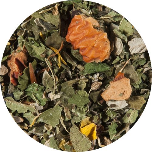 Brombeerblätter, Anis, Fenchel, Apfelstücke, Holunderbeeren, Hagebuttenschalen, Hibiskusblüten, Sonnenblumenblüten, Ringelblumenblüten, Aroma