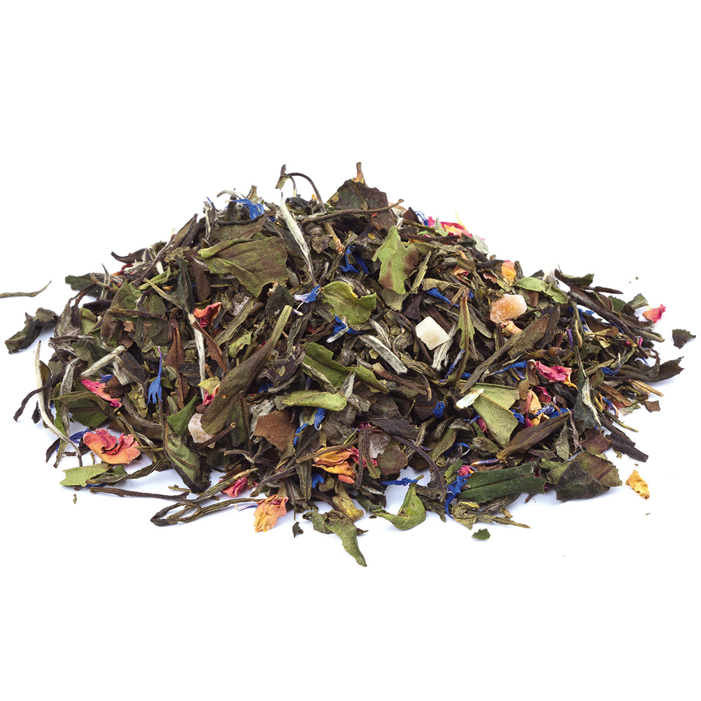 Weißer Tee (44%), Grüner Tee (39%), Mangostücke (Mango, Zucker, Säuerungsmittel: Zitronensäure), Papayastücke (Papaya, Zucker), Rosenblütenblätter, Aroma, Kornblumenblüten.