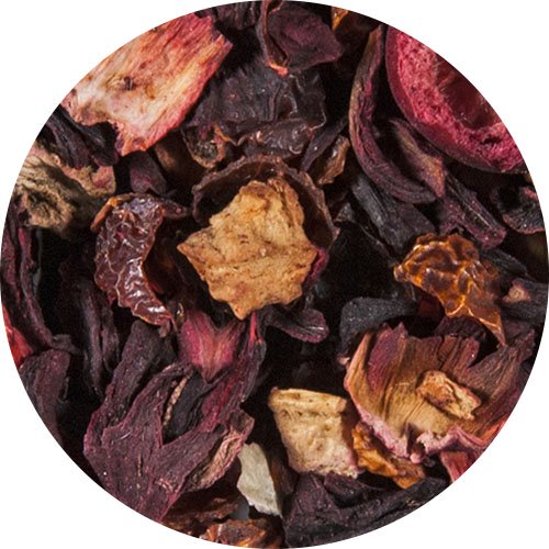 Hibiskusblüten, Hagebuttenschalen, Apfelstücke, Orangenschalen, Aromen, Cranberryscheiben, Sauerkirschen (1 %)