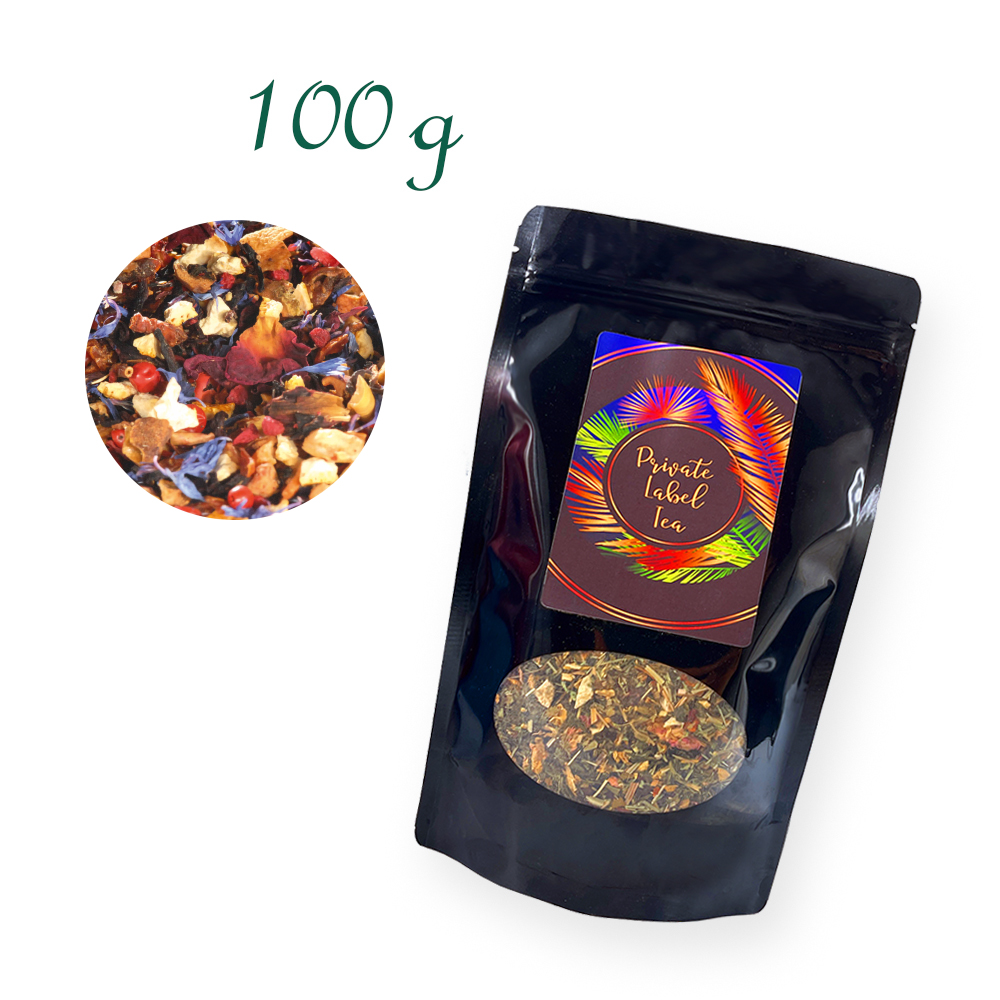 Apfelstücke (37%), Hibiskusblüten (28%), Orangenschalen (9%), Hagebuttenschalen, Rosa Pfeffer, Himbeerstücke (3%), Aroma, Kornblumenblüten, Rosenblütenblätter, natürliches Orangen-Aroma.
