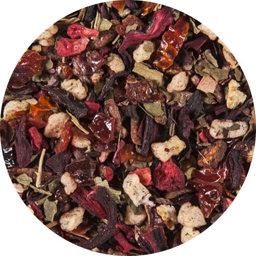 Hibiskusblüten, Hagebuttenschalen, Apfelstücke, süße Brombeerblätter, Aromen, Orangenschalen, Himbeerstücke, Apfeltrester, Säuerungsmittel: Citronensäure