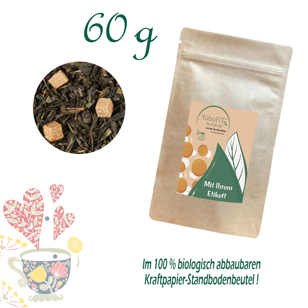 Grüner Tee China Sencha, Karamellstücke (gezuckerte Kondensmagermilch, Zucker, Glukosesirup, Butterfett, Feuchthaltemittel: E420, Emulgator: E471) (5 %), Aromen