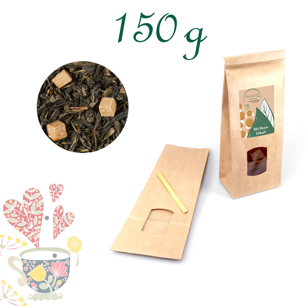 Grüner Tee China Sencha, Karamellstücke (gezuckerte Kondensmagermilch, Zucker, Glukosesirup, Butterfett, Feuchthaltemittel: E420, Emulgator: E471) (5 %), Aromen