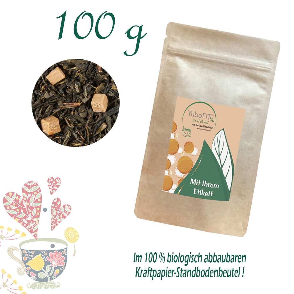 Grüner Tee China Sencha, Karamellstücke (gezuckerte Kondensmagermilch, Zucker, Glukosesirup, Butterfett, Feuchthaltemittel: E420, Emulgator: E471) (5 %), Aromen