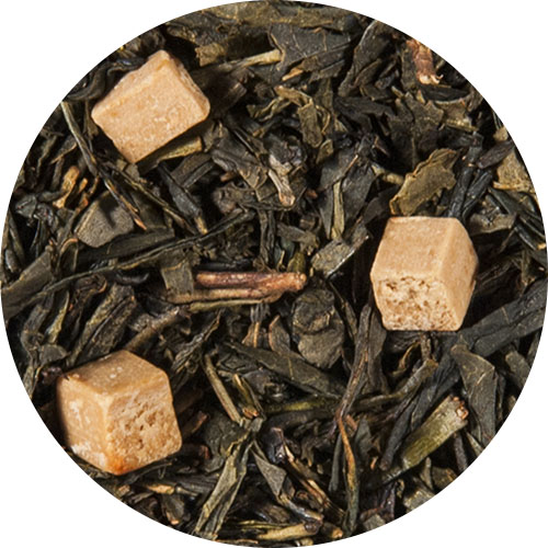 Grüner Tee China Sencha, Karamellstücke (gezuckerte Kondensmagermilch, Zucker, Glukosesirup, Butterfett, Feuchthaltemittel: E420, Emulgator: E471) (5 %), Aromen