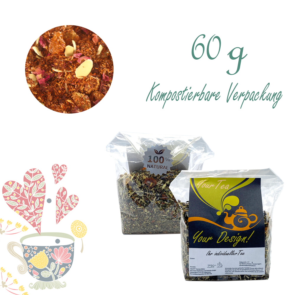 Rotbuschtee (64%), MANDELSTÜCKE (7%), Apfelstücke, gelbe Sultaninen (Sultaninen, Konservierungsstoff: SCHWEFELDIOXID / SULFITE), Sultaninen, Dattelstücke, Aroma, Rote-Bete-Stücke, Rosenblütenblätter.