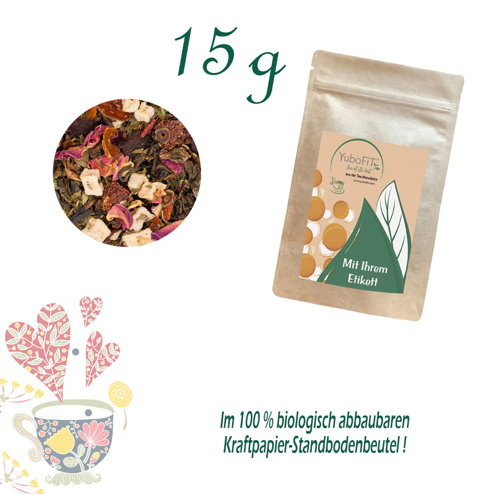 Hagebuttenschalen, Apfel, Oolong Tee (12 %), Pfefferminze, Hibiskus, Pu Erh Tee - Tee mit spezieller Fermentation (8 %), Rote Bete, Krauseminze, Rosenblüten, Aromen, Erdbeerstücke
