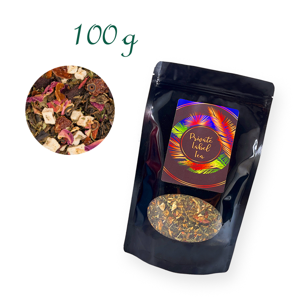 Halbfermentierter Oolong und nachfermentierter Pu Erh bilden eine spannende geschmackliche Grundlage für diese frisch-fruchtige Teekomposition.