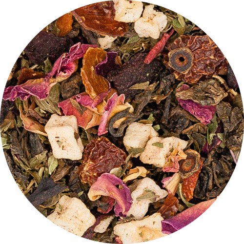 Hagebuttenschalen, Apfel, Oolong Tee (12 %), Pfefferminze, Hibiskus, Pu Erh Tee - Tee mit spezieller Fermentation (8 %), Rote Bete, Krauseminze, Rosenblüten, Aromen, Erdbeerstücke