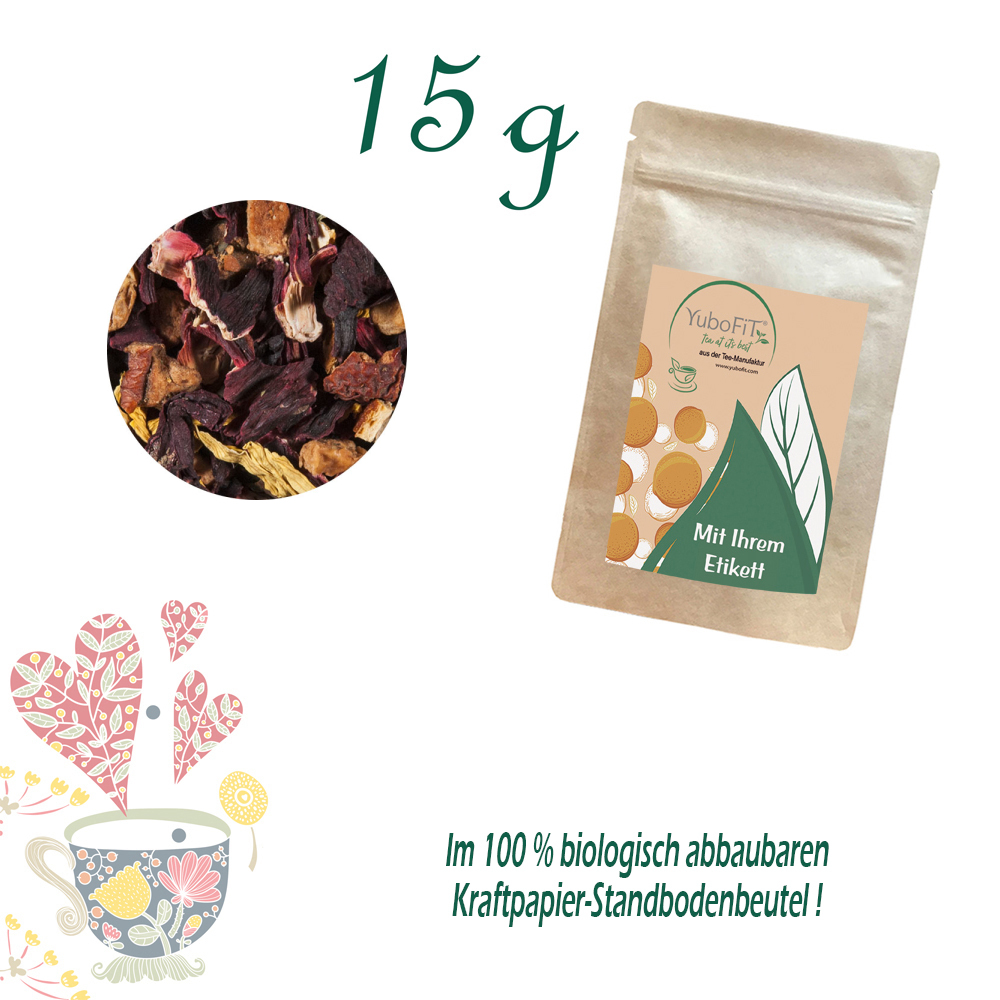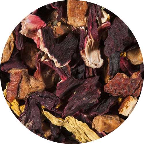 Hibiskusblüten, Orangenschalen, Apfelstücke, Pfefferminze (8,5 %), Brombeerblätter, Sonnenblumenblüten
