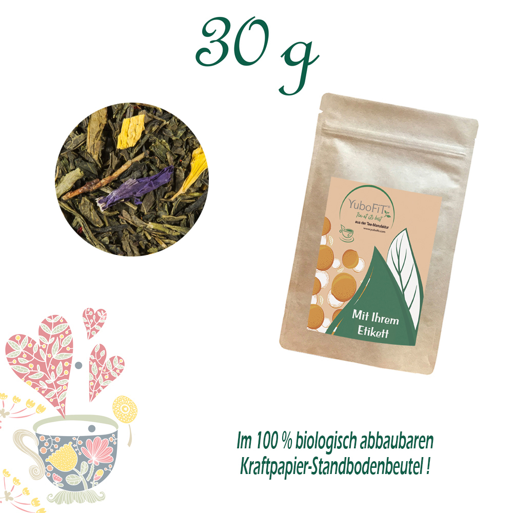 Grüner Tee China Sencha, Orangenschalen, Aromen, Malvenblüten, Färberdistelblüten, Sonnenblumenblüten