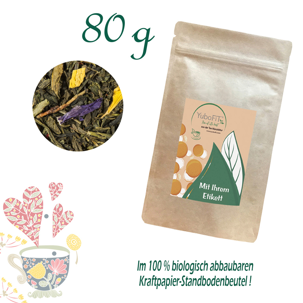 Grüner Tee China Sencha, Orangenschalen, Aromen, Malvenblüten, Färberdistelblüten, Sonnenblumenblüten