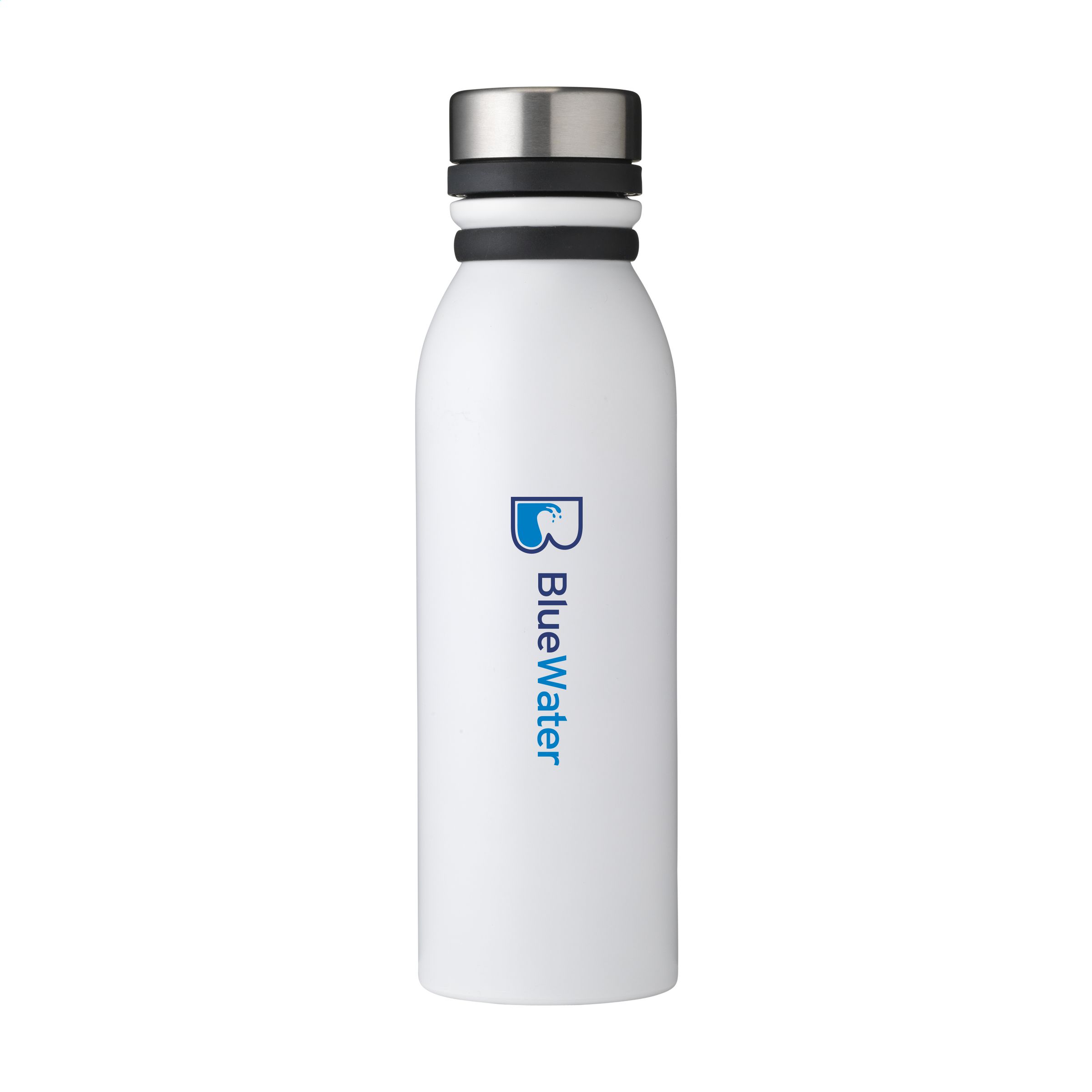 Doppelwandige, vakuumisolierte, auslaufsichere Edelstahl-Wasserflasche / Thermoflasche. Der Schraubverschluss ist an einer drehbaren Silikon-Trageschlaufe befestigt und rastet beim Öffnen der Flasche ein. So haben Sie immer eine Hand frei. Geeignet zur Temperaturerhaltung von kalten oder heißen Getränken. Nicht spülmaschinengeeignet. Fassungsvermögen 600 ml. Wird einzeln in einem Kraftkarton geliefert.
