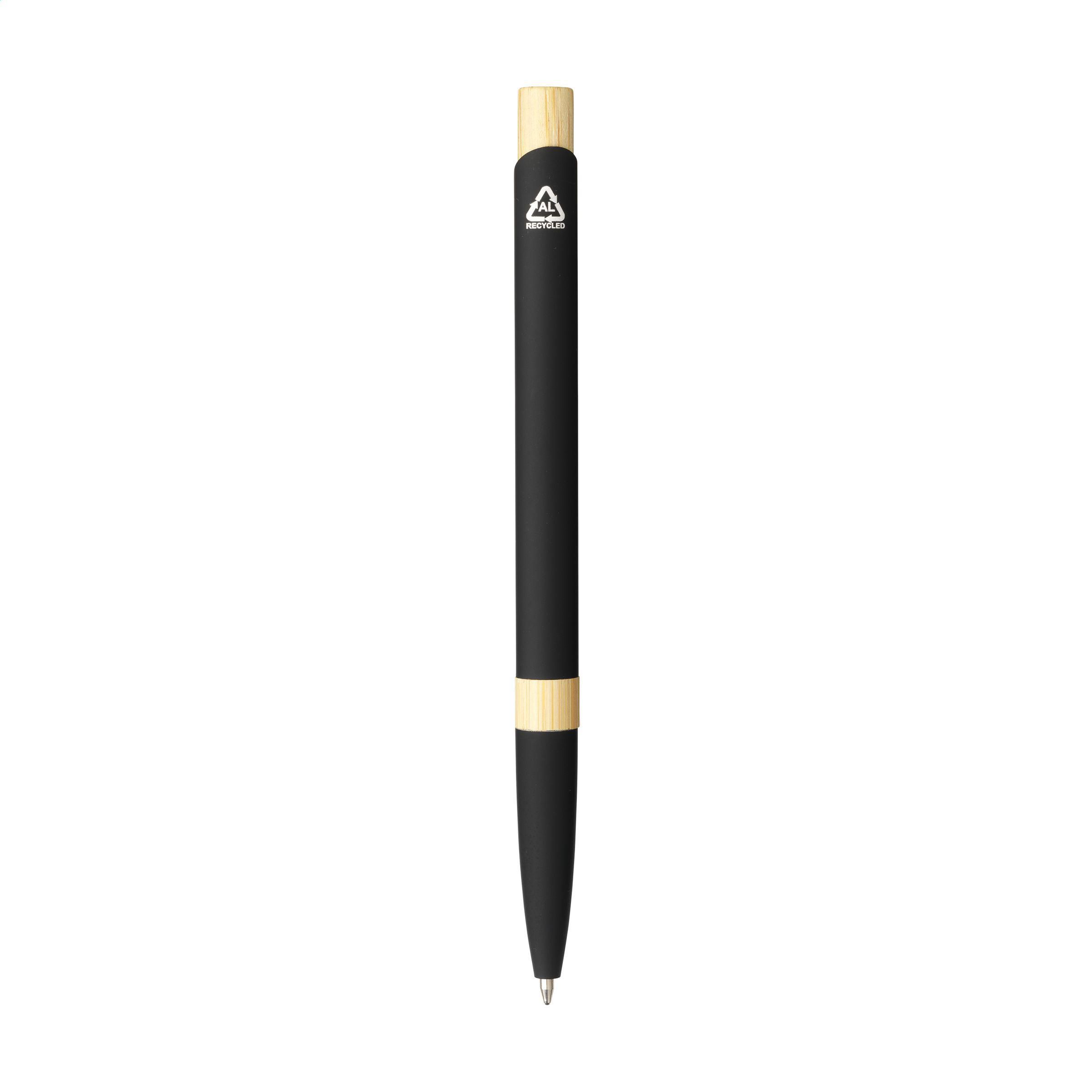 Beschreibung: Blauschreibender, schlanker Kugelschreiber mit Gehäuse aus 100% recyceltem Aluminium mit gummierter Oberfläche und stabilem Metallclip. Die Bambusakzente verleihen dem Stift einen natürlichen Charakter. GRS-zertifiziert. Durch die Verwendung von recyceltem Aluminium kommt eine geringere Menge an neuen Rohstoffen zum Einsatz. Das bedeutet weniger Energieverbrauch und weniger Wasserverbrauch.