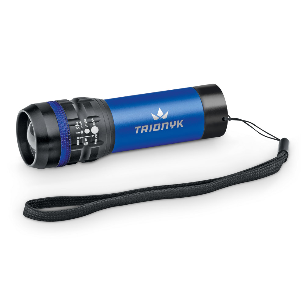 Taschenlampe aus Aluminium mit Zoomfunktion und 3 Lichtmodi. 1W LED Lampe und Halteschlaufe. Inklusive 3 AAA-Batterien. Geliefert in einer Geschenkschachtel. ø33 x 103 mm | Schachtel: 115 x 43 x 40 mm