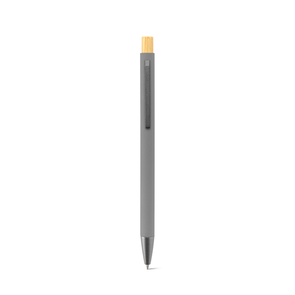 Recycelter Aluminium-Kugelschreiber (100% RAL) mit Gummibeschichtung. Sein minimalistisches Design kombiniert matte metallgraue Details mit einem Bambusknopf an der Oberseite. Er hat einen Clip und blauschreibende Mine. Bei einer Lasergravur wird die Veredelungsfarbe Silber. Da das Produkt aus natürlichen Materialien hergestellt wird, können Farbe des Produkts sowie das Druckergebnis von Produkt zu Produkt unterschiedlich sein. ø9 x 135 mm