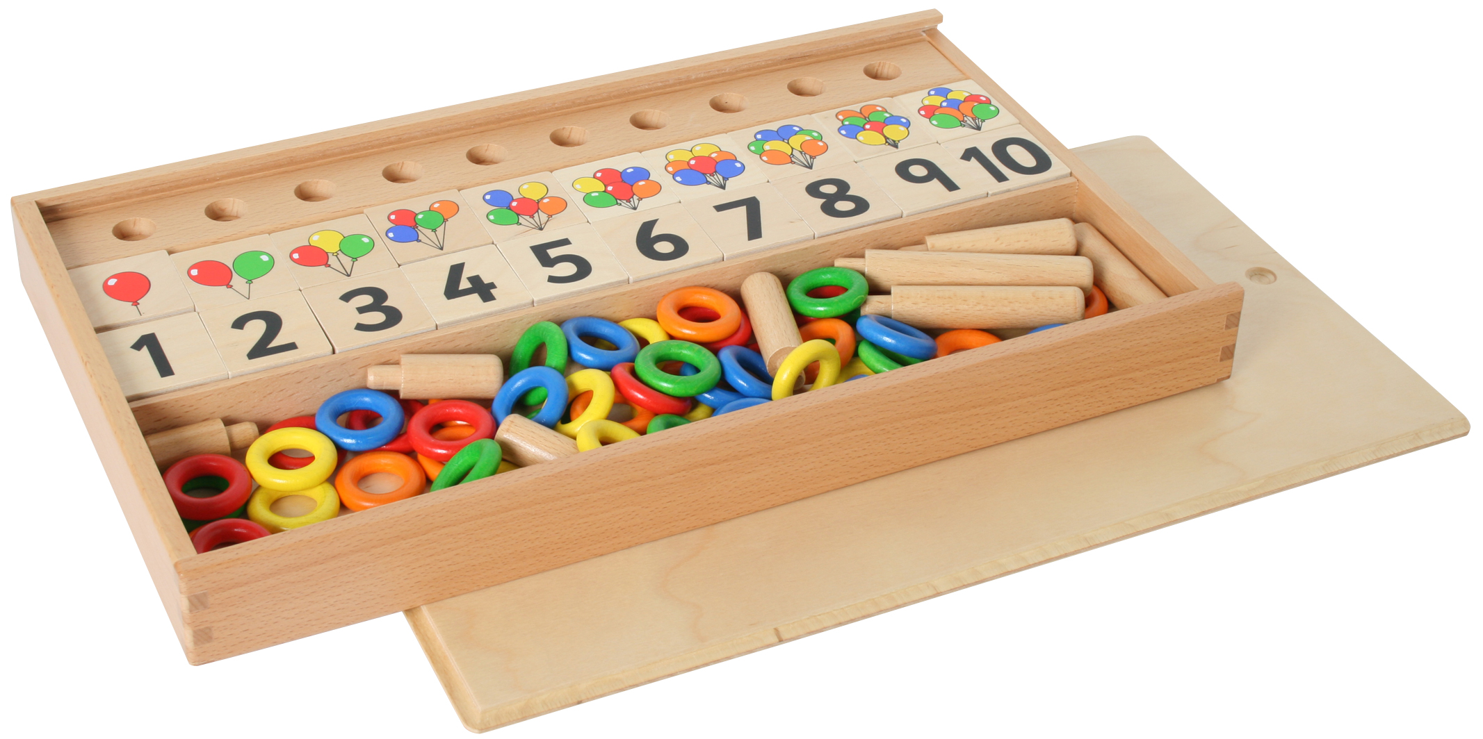 Inhalt: 1 massiver Holzschubkasten mit 55 farbigen Ringen, 10 Stäbchen, 10 Zahlen- und 10 Bildkärtchen. Beim Spiel lernen Kids die Zahlen 1 - 10 und verschiedene Farben kennen. Sie trainieren die Hand-Auge-Koordination, lernen sich zu konzentrieren ...