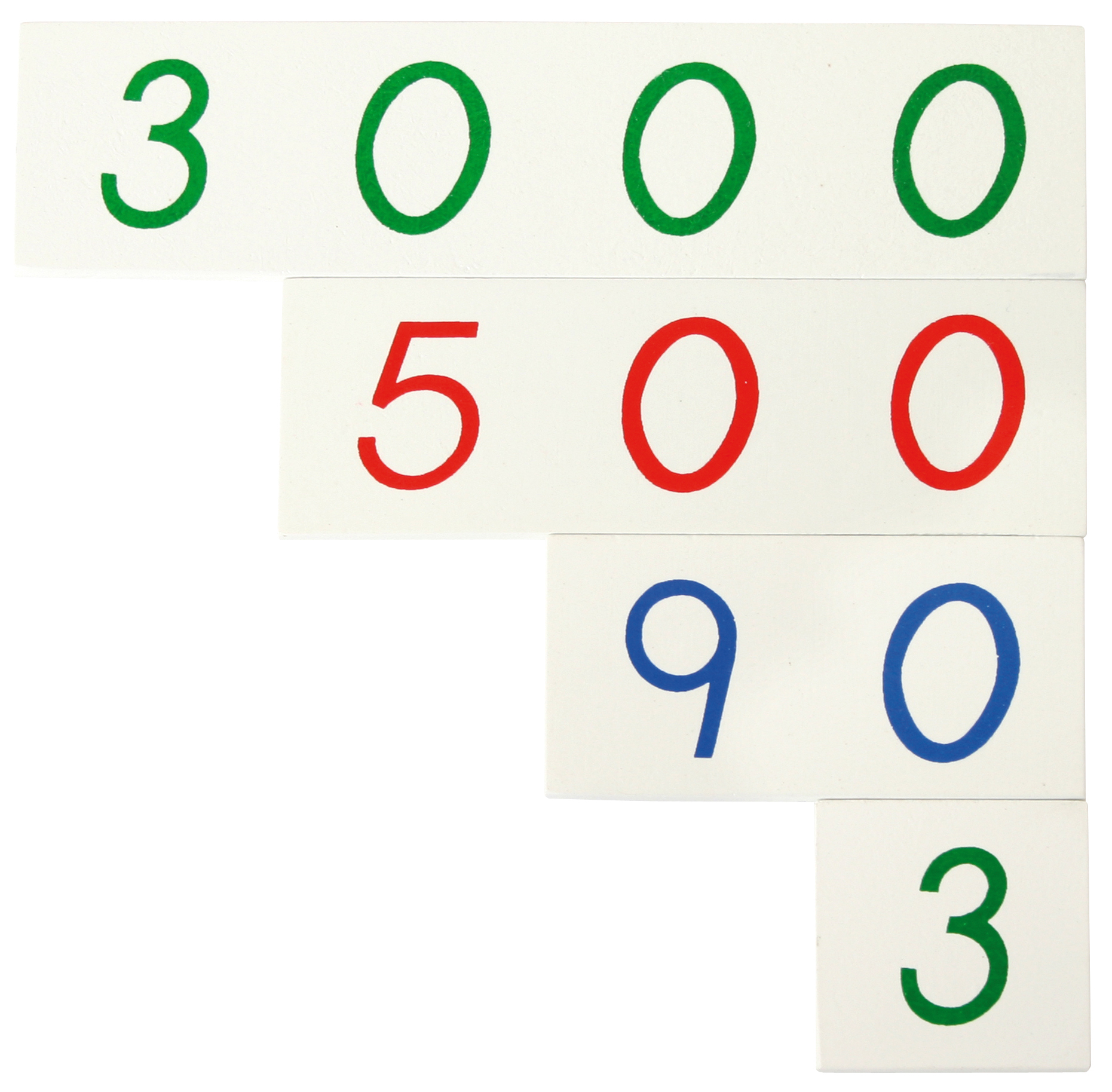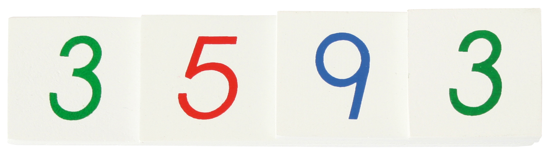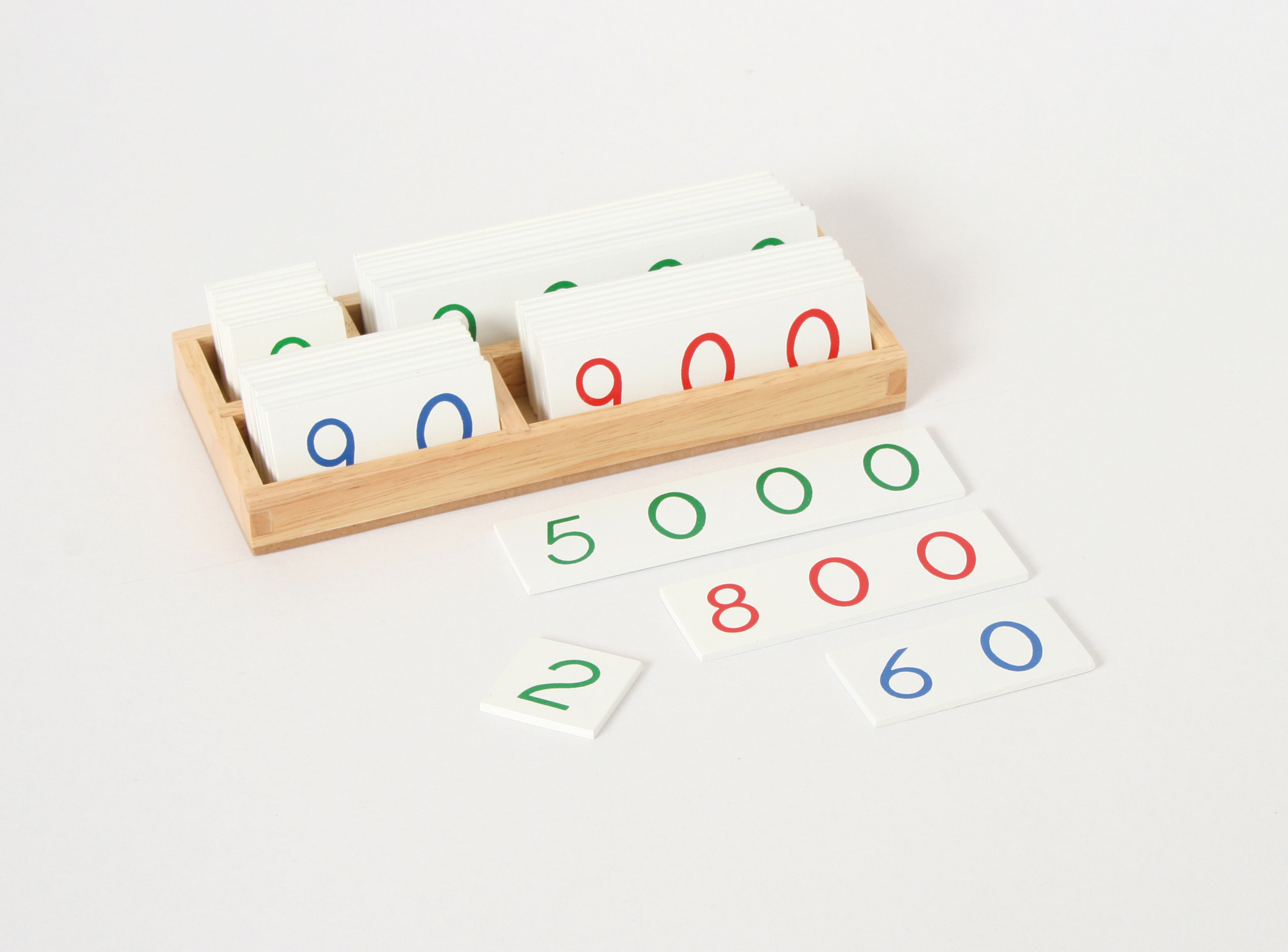 Kleine Zahlenkarten aus Holz im Holzkasten. Der dargestellte Zahlenbereich reicht von 1 - 9000. Die Hierarchie der Zahlen wird durch die Länge der Karten und die Farbe der Zahlen dargestellt. Die Einer sind grün, die Zehner sind blau, die Hunderter rot und die Tausender als Einheit der folgenden Kategorie wieder grün. Damit lernen Kinder das Dezimalsystem kennen und üben die Addition und Subtraktion. Die Zahlenkarten werden bevorzugt als Hilfsmittel bei der Arbeit mit dem Perlenmaterial genutzt, um Aufgaben und Arbeiten aufzubereiten. Die Tafeln verdeutlichen die Zahlenschritte Einer, Zehner, Hunderter und Tausender. Größe des Kastens: 18 x 8 x 1,7 cm. Größe einer Tausender-Karte: 12 x 3 x 0,3 cm. Selbstkontrolle durch Perlenmaterial oder vorgegebene Aufgaben. Ab 5 Jahren.