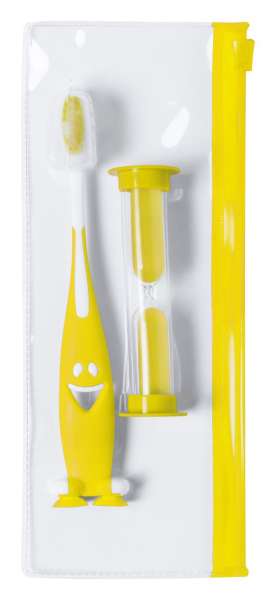 Kinder-Zahnbürste aus Kunststoff mit Sanduhr, verpacht im Kunststoff-Etui.