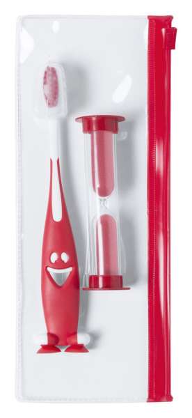 Kinder-Zahnbürste aus Kunststoff mit Sanduhr, verpacht im Kunststoff-Etui.