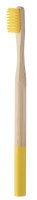 Erwachsenen-Zahnbürste mit Bambusgriff und farbigen Borsten aus Nylon. Mit farblich abgestimmten Verzierungen am Griffende. Verpackt in Kraftpapierbox.