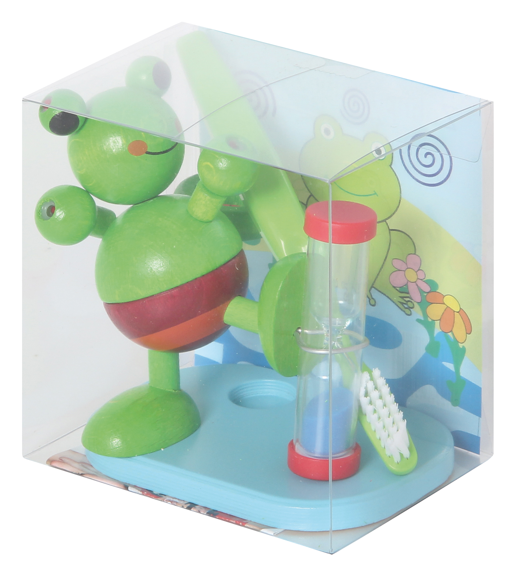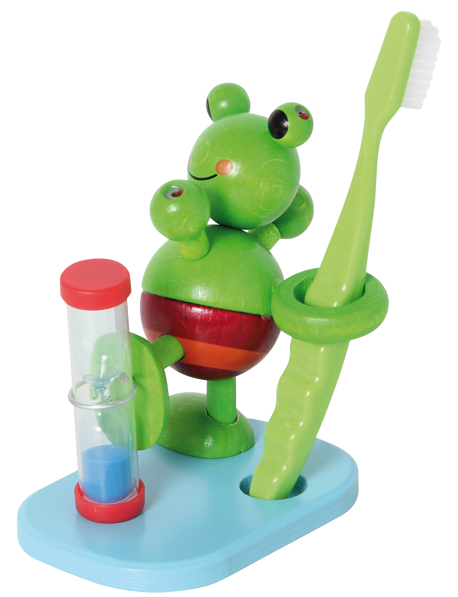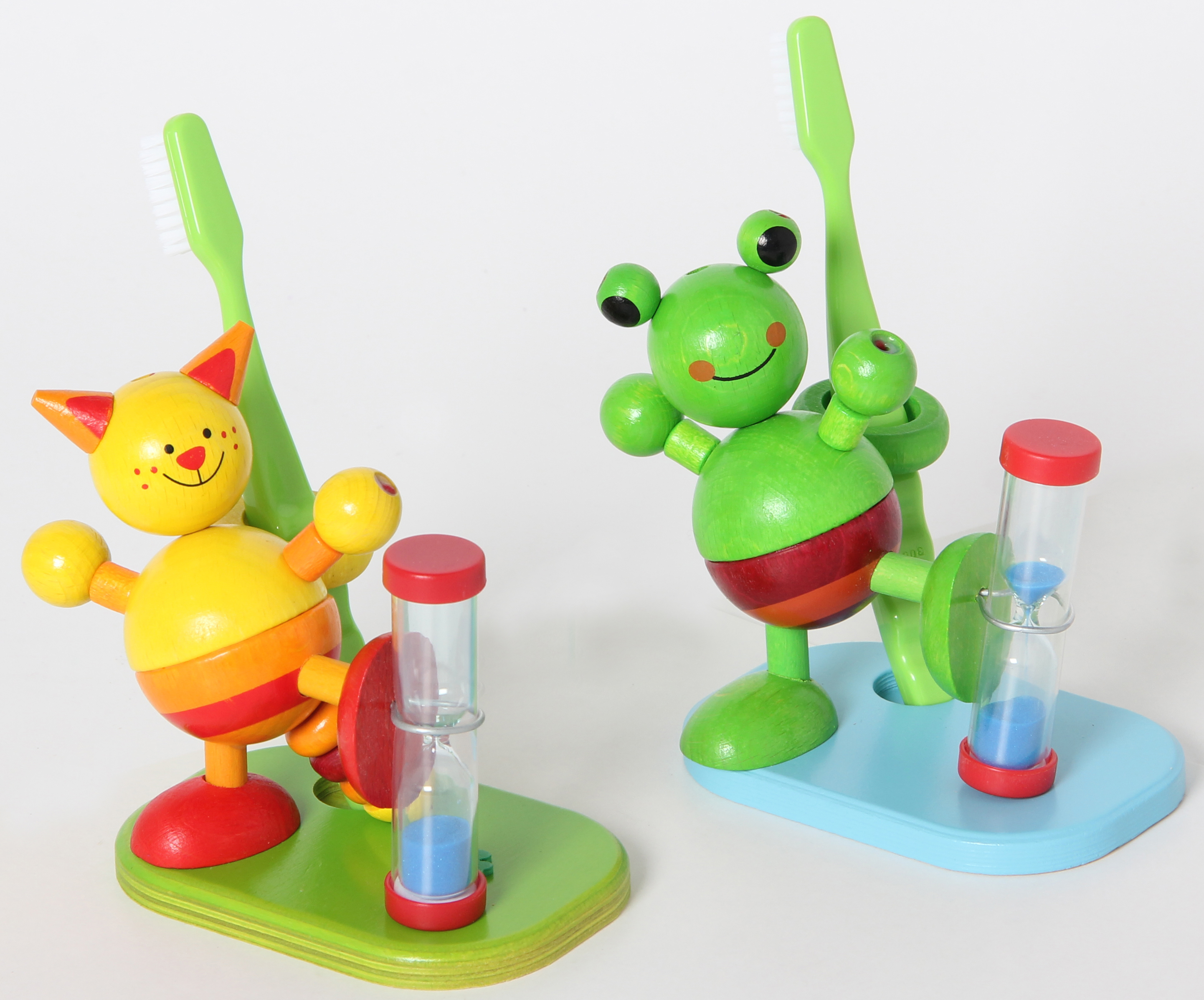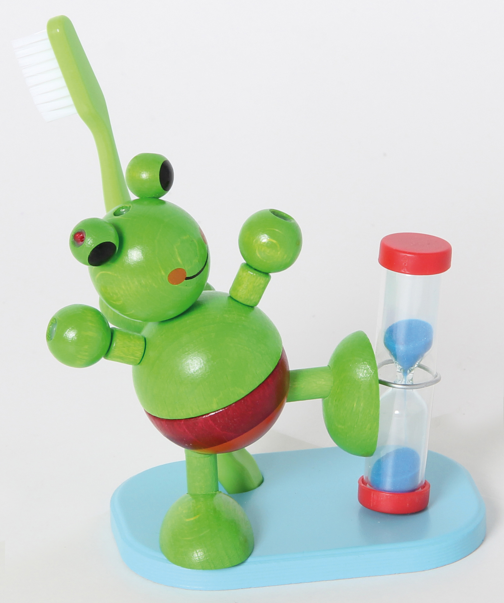 Mit einer Kinder-Zahnbürste und einer Sanduhr macht die Holzfigur Lust aufs Zähneputzen.