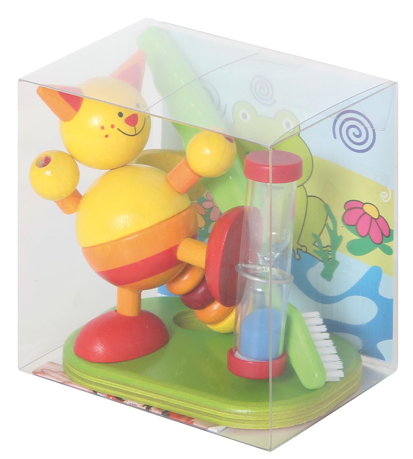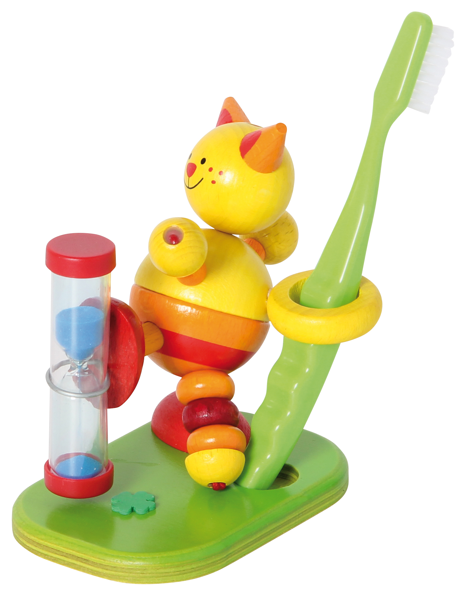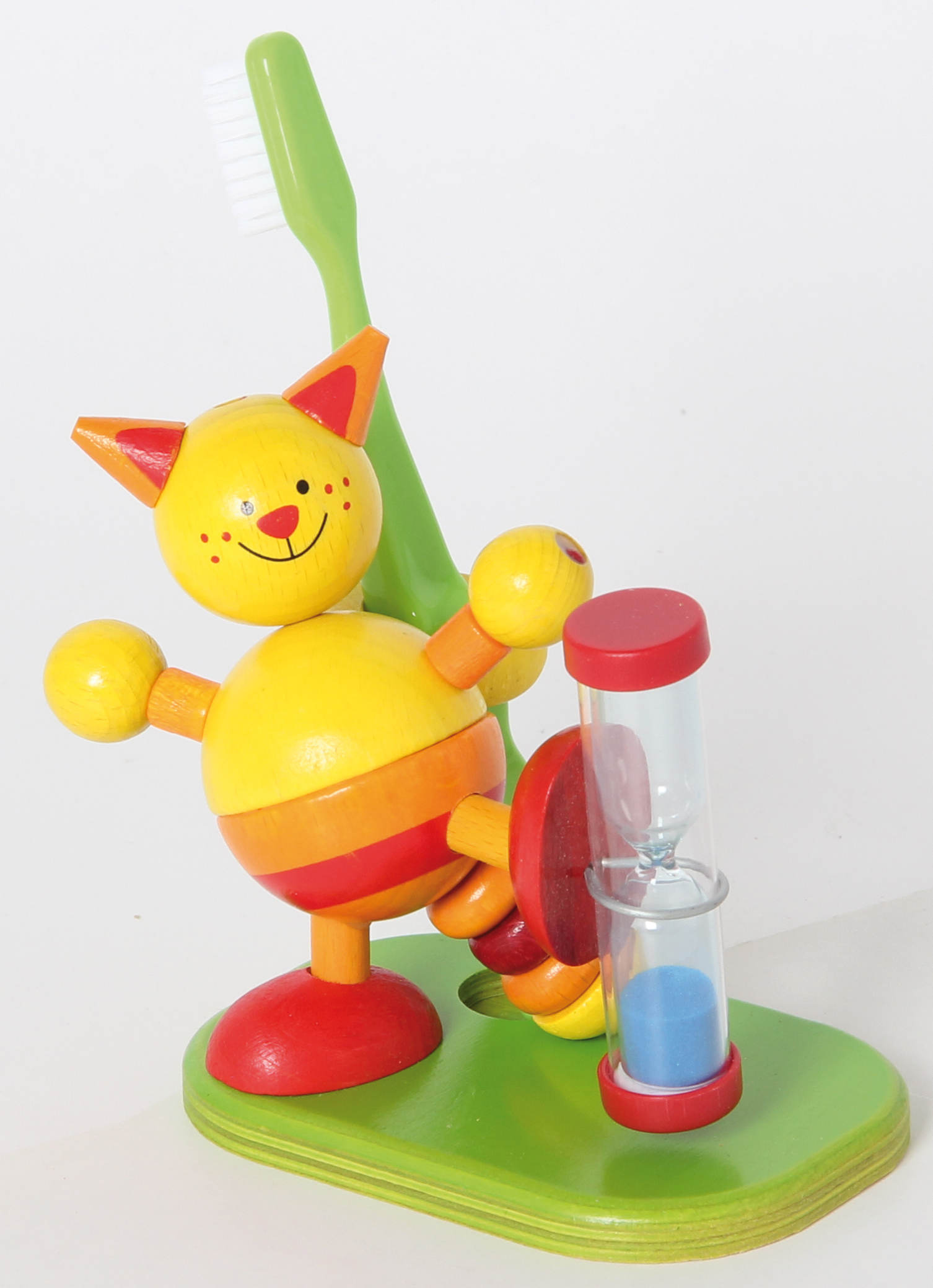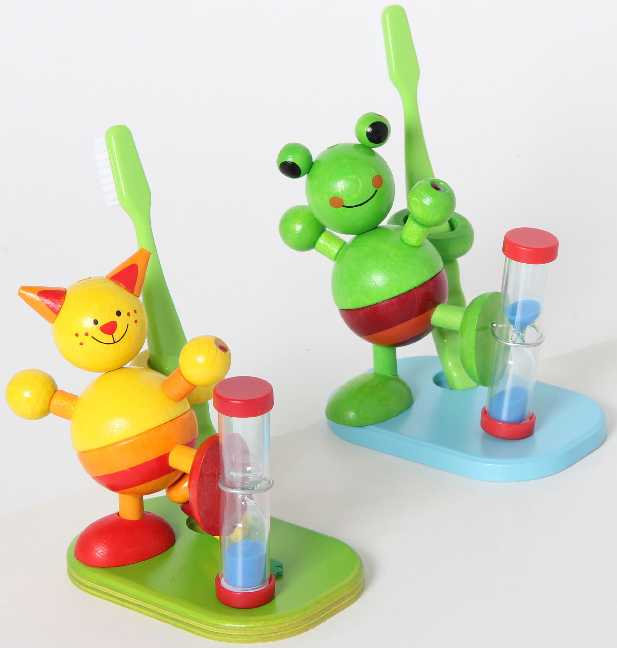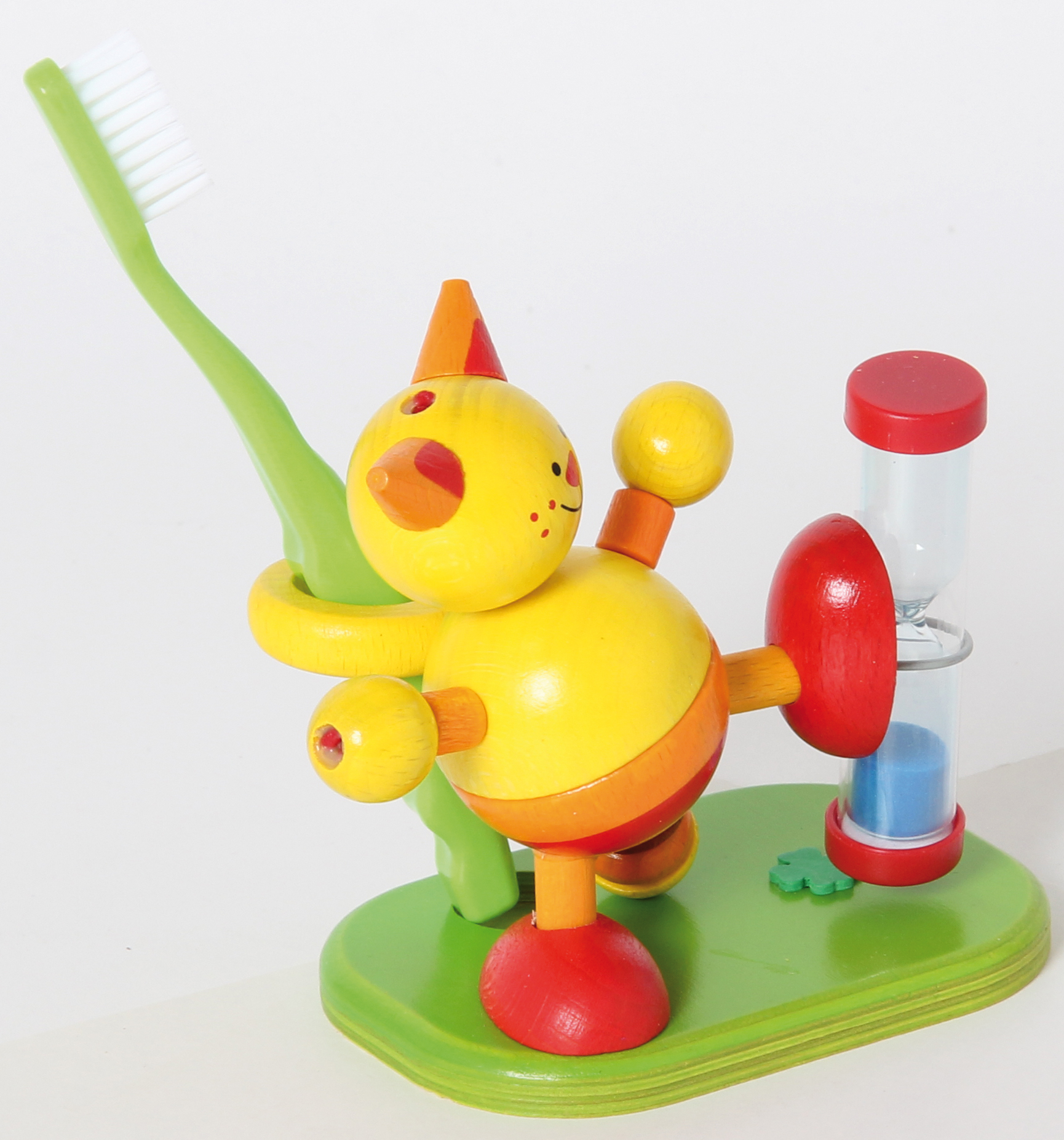 Mit einer Kinder-Zahnbürste und einer Sanduhr macht die Holzfigur Lust aufs Zähneputzen.