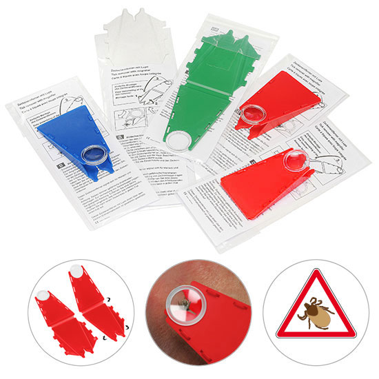 Zeckenentferner mit Lupe klappbar, inkl. Gebrauchsanweisung (D / GB / F) und Einzelverpackung im Polybeutel. Besonders geeignet für Mailings