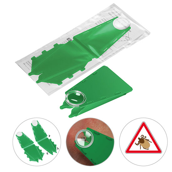 Zeckenentferner mit Lupe klappbar, inkl. Gebrauchsanweisung (D / GB / F) und Einzelverpackung im Polybeutel. Besonders geeignet für Mailings