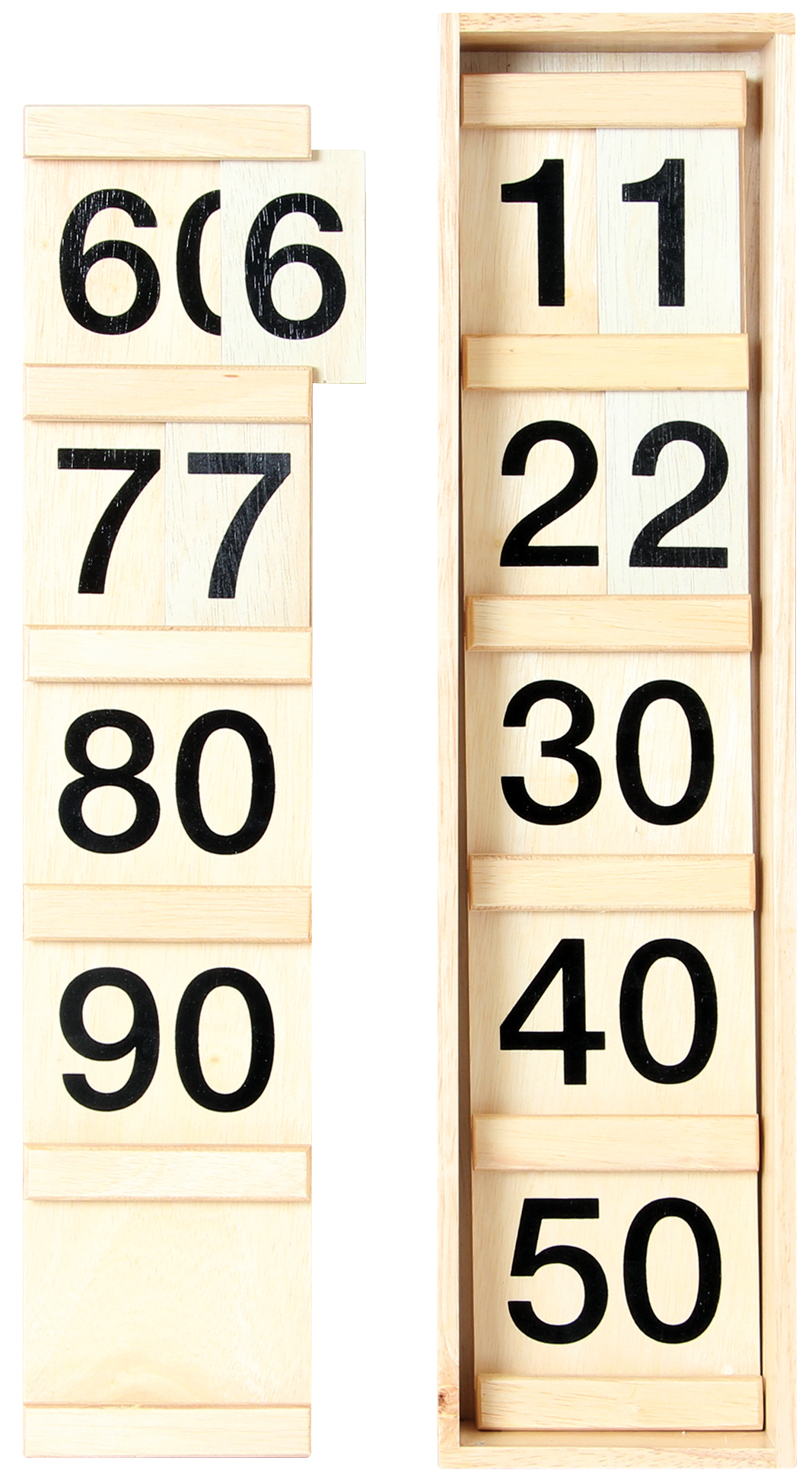 Mit den Seguintafeln II lernt das Kind die Zahlen 11 bis 99 und deren Symbole kennen, nachdem es mit dem Perlenmaterial gelernt hat, Mengen zu benennen. Das Material besteht aus zwei Brettern mit je fünf Feldern. Auf neun Feldern stehen die Zahlen 10 bis 90. Das letzte Feld ist frei. Mit neun hölzernen Ziffernplättchen (1 - 9) werden die Zahlen 11 bis 99 gebildet. Inklusive Holzbox mit Deckel zum Aufbewahren. Selbstkontrolle: Reihenfolge der Zahlen muss stimmen. Es darf kein Ziffernplättchen übrig bleiben. Größe einer Tafel: 48 x 10 x 2,5 cm. Ab 4 Jahren.