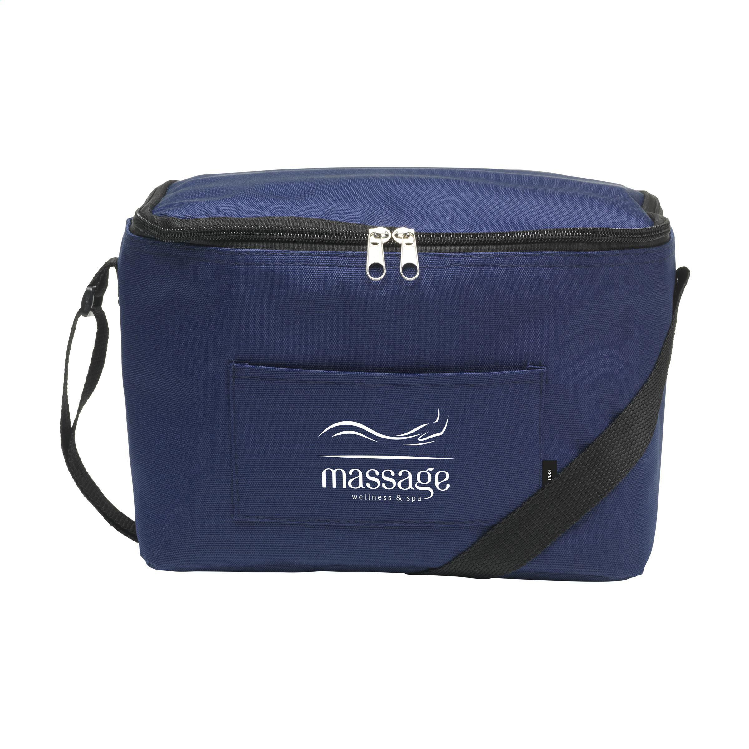 Kühltasche aus 600D-RPET-Polyester. Auskleidung aus 100% PEVA. Mit Einsteckfach auf der Vorderseite und verstellbarem Trageriemen aus Polyester. GRS-zertifiziert. Gesamtes recyceltes Material: 51%. Fassungsvermögen ca. 7,5 Liter.
