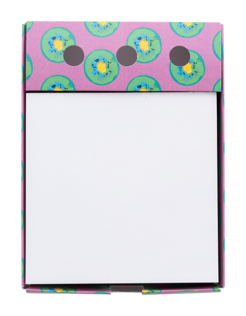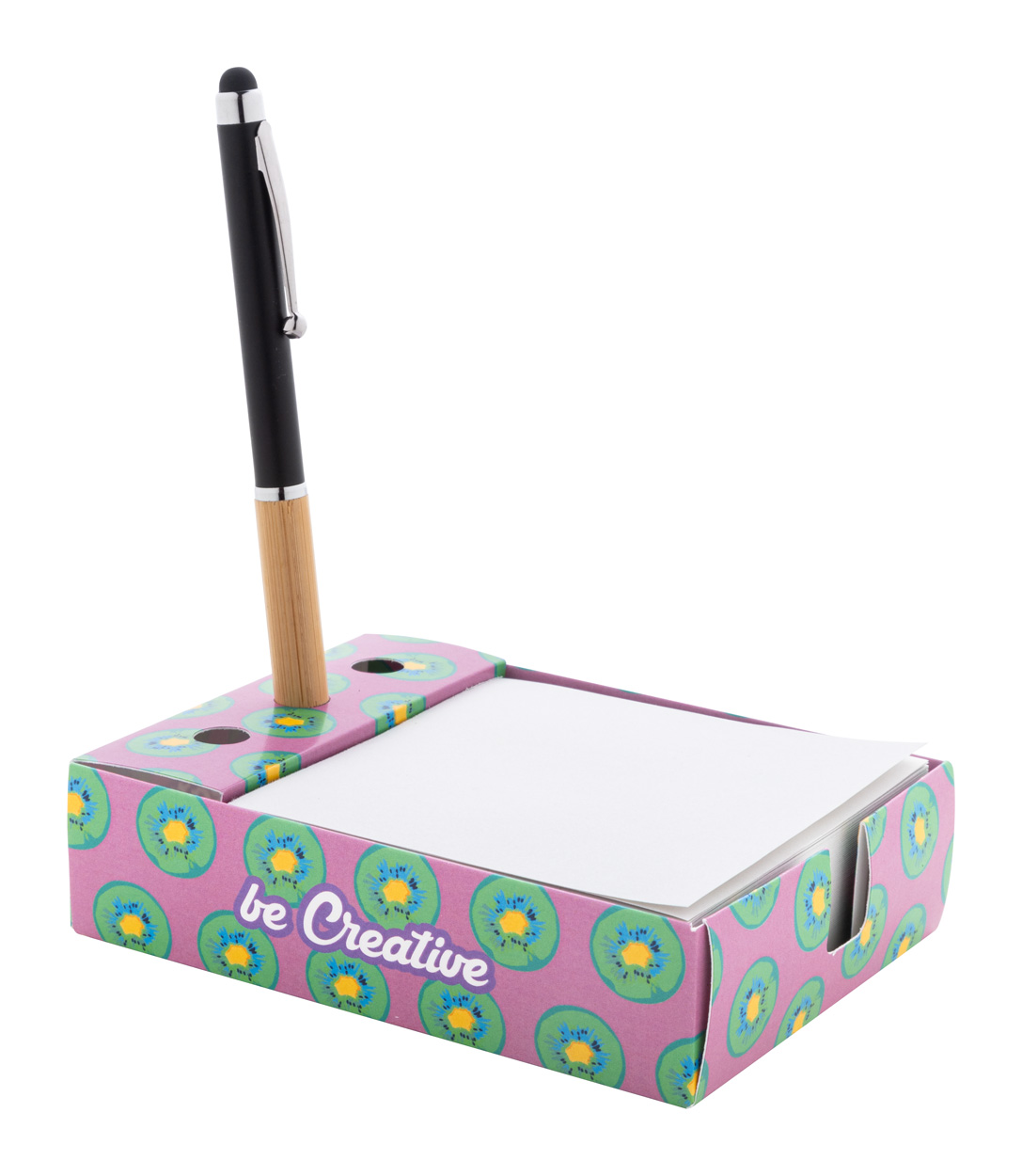 Individueller Stifthalter und Zettelspender aus Papier mit 300 Blatt Memoblock aus Recyclingpapier (90×90 mm). Der Preis beinhaltet einen Vollfarbdruck auf dem Halter. Mindestmenge: 100 Stk.