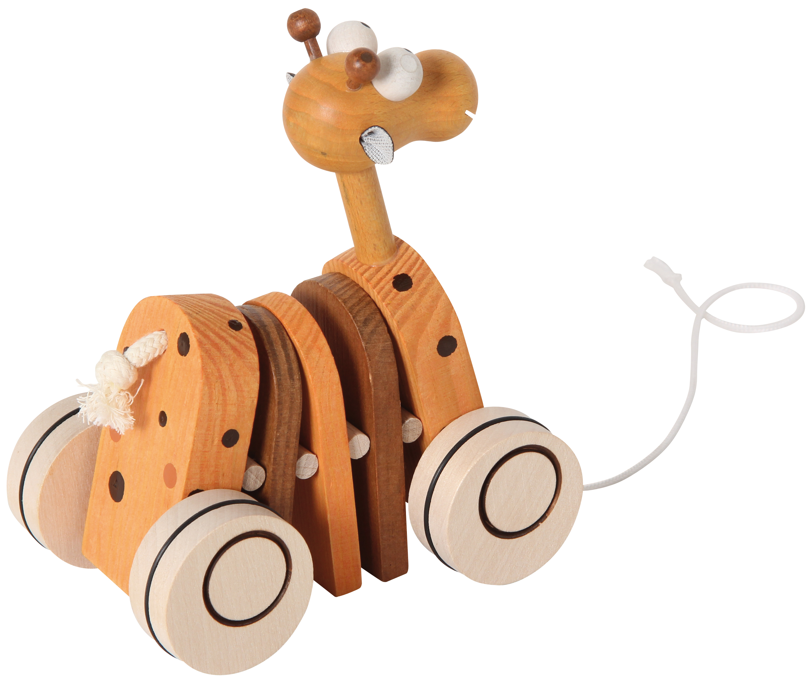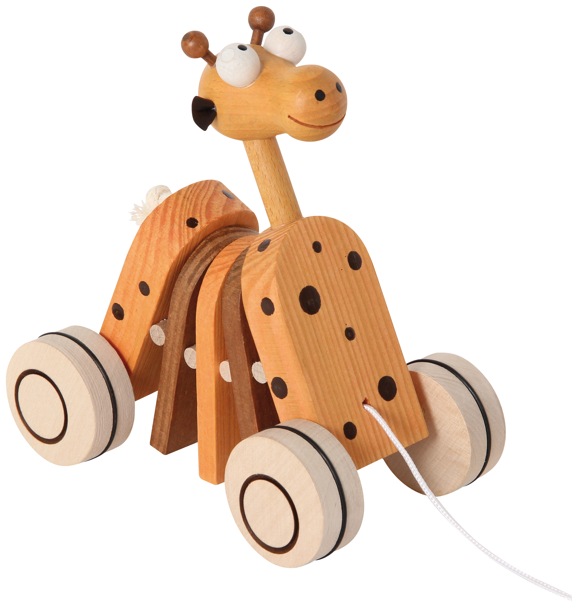 Die freundliche Giraffe aus Holz wackelt beim Spaziergang lustig hinterher.