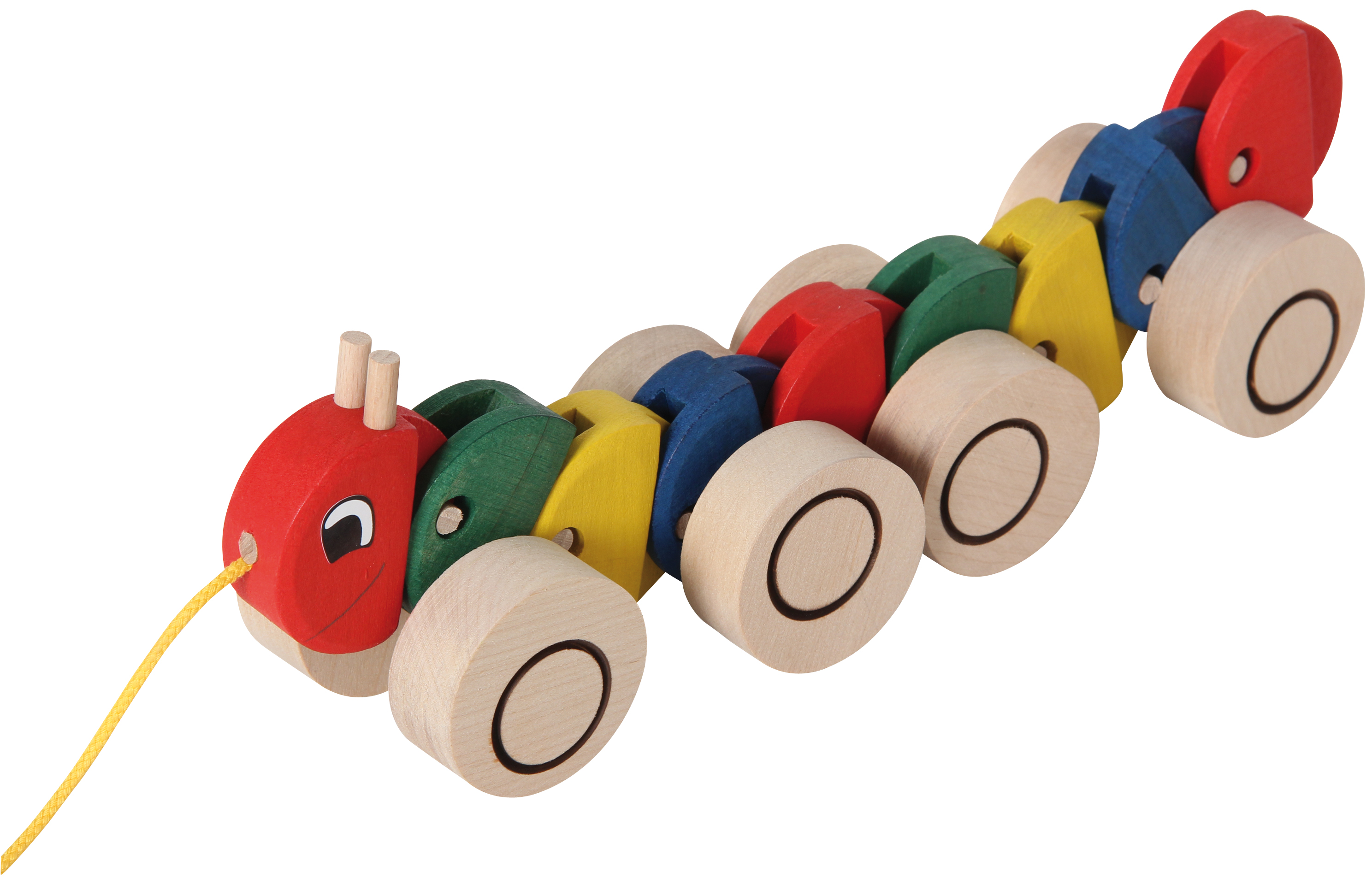 Die farbenfrohe Raupe aus Holz wackelt beim Spaziergang lustig hinterher.