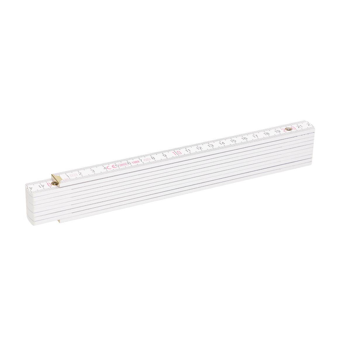 Hochwertiger weißer Glieder-Maßstab aus Buchenholz. Hohe Qualität durch die metallenen Gelenke und die sichtbaren Nieten. Länge: 2 m.