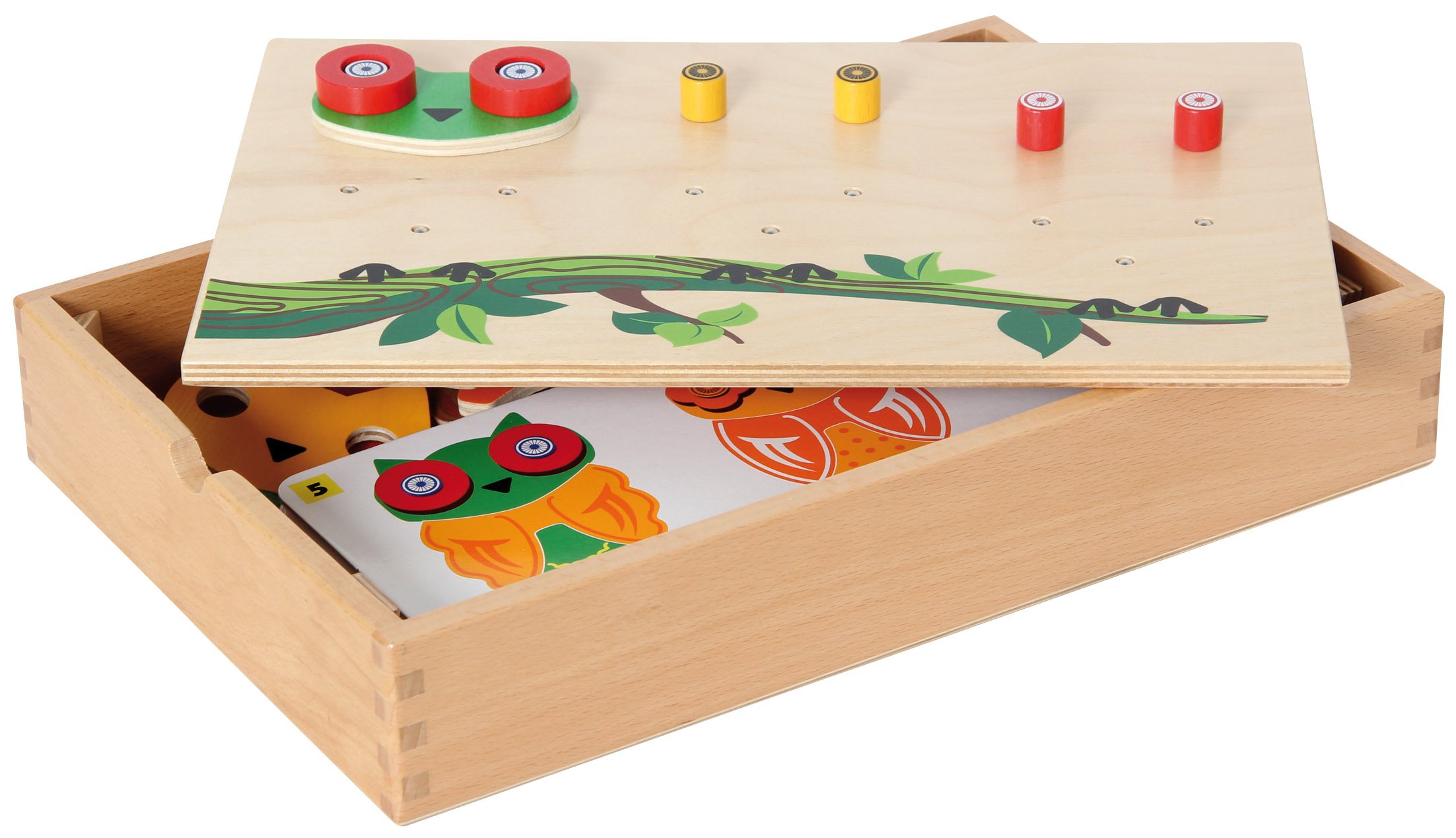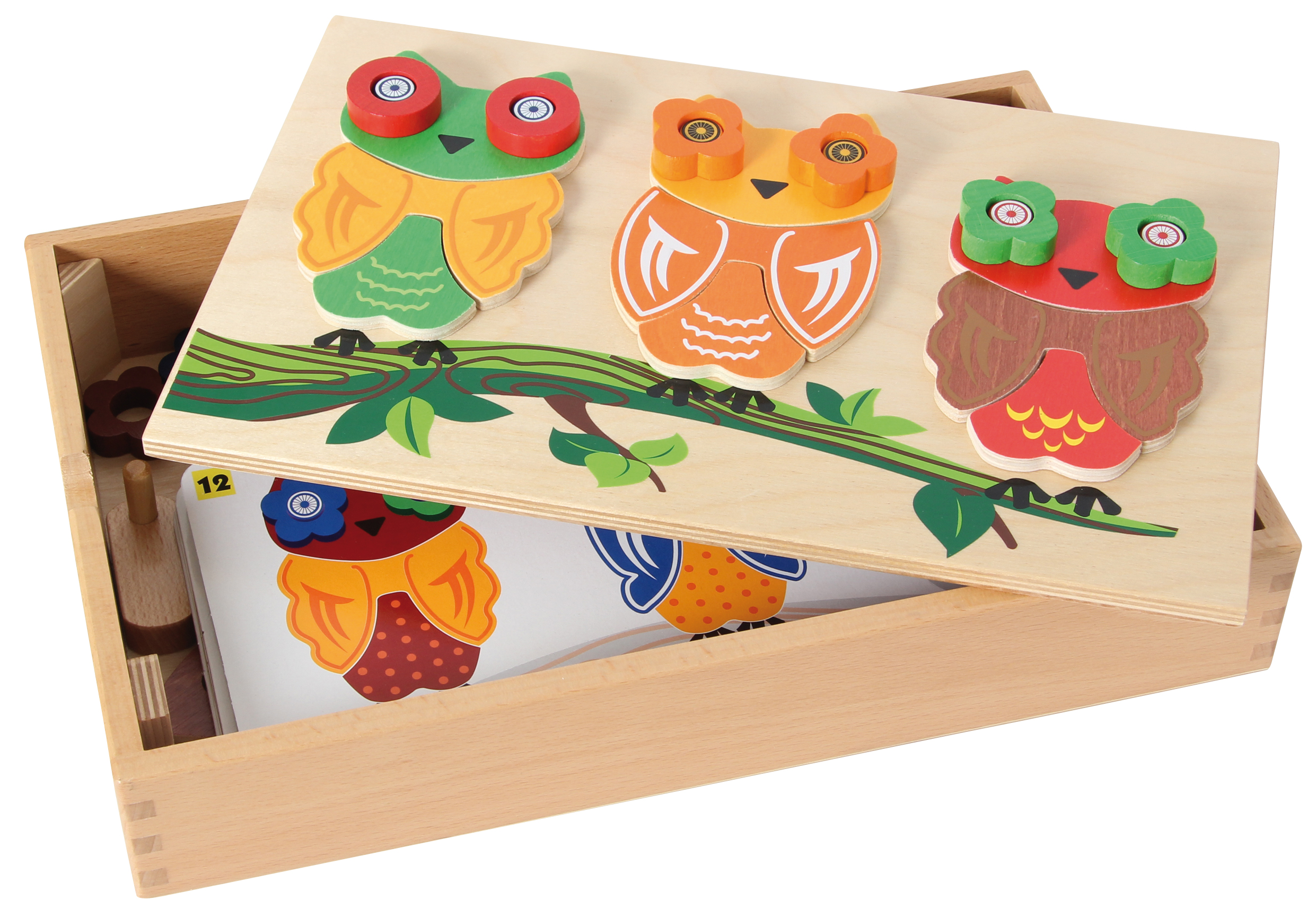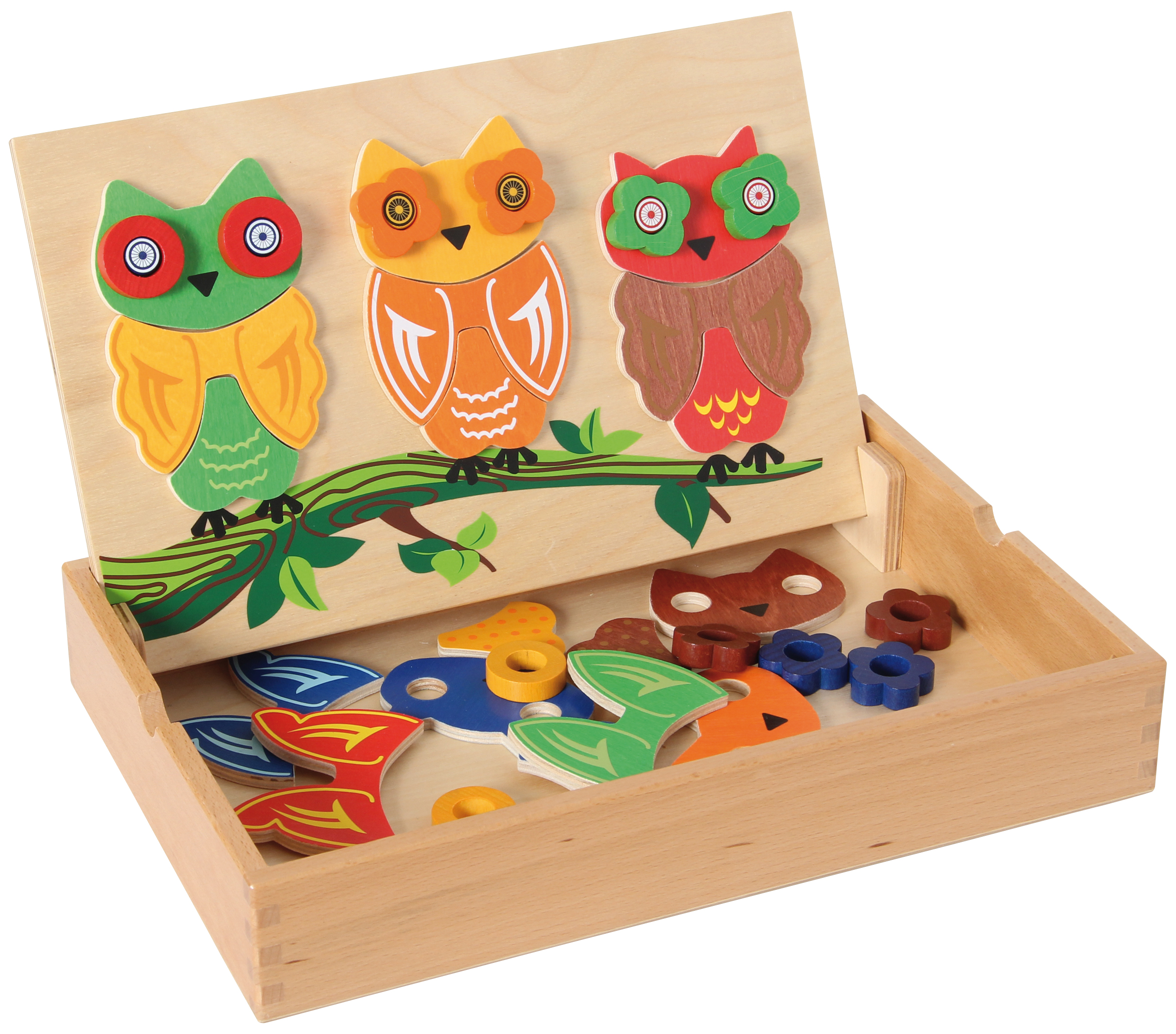 Holzbox mit 30, teilweise magnetischen Puzzleteilen und beidseitig bedruckten Vorlagenkarten. Beim Zusammensetzen der Eulen nach Vorlage oder eigenen Ideen, entwickelt man seine Kreativität, die Farb- und Formerkennung und seine Hand-Auge-Koordination. Hochwertige Ausführung aus Buchenholz! In Kindergartenqualität!